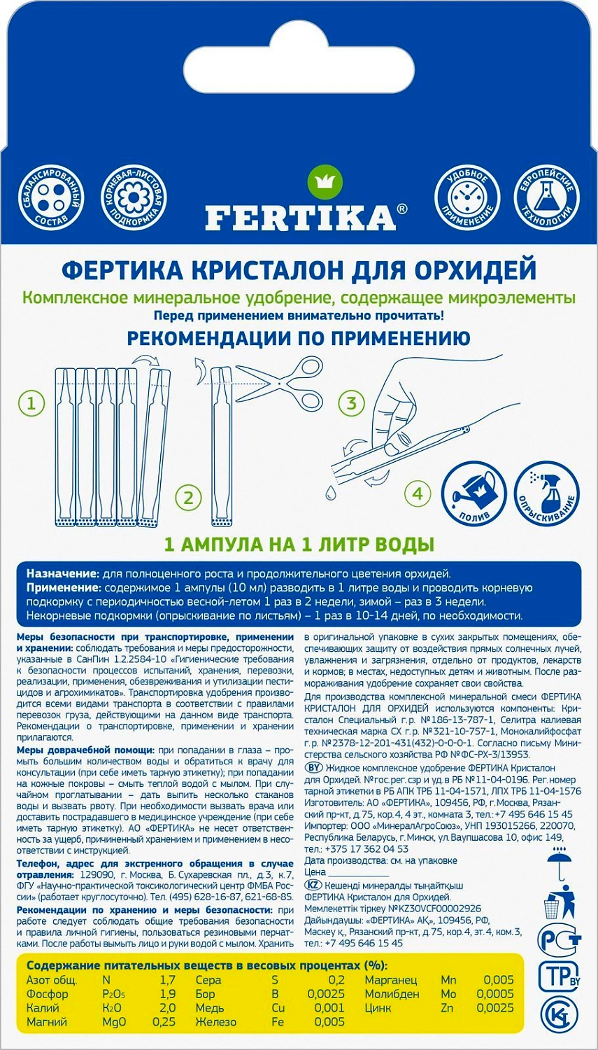 Минеральный комплекс в виде концентрированного жидкого раствора в ампулах предназначен для полноценного питания и роста всех видов орхидей. Удобрение включает необходимые макро- и микроэлементы, способствующие здоровому развитию растений. В каждой ампуле содержится оптимальное количество минеральных веществ.