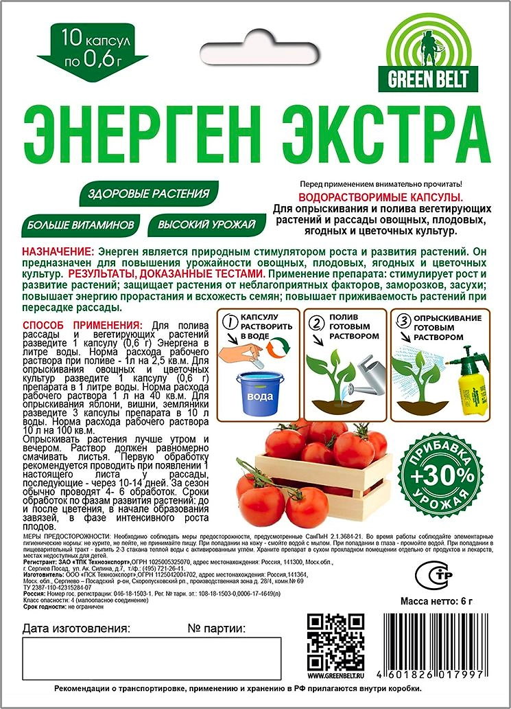Регулятор для полива и опрыскивания овощных и цветочных культур, водорастворимые капсулы.