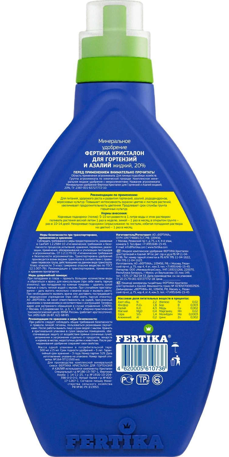 Удобрение комплексное FERTIKA Кристалон для цветочных гортензий и азалий 0,5 л