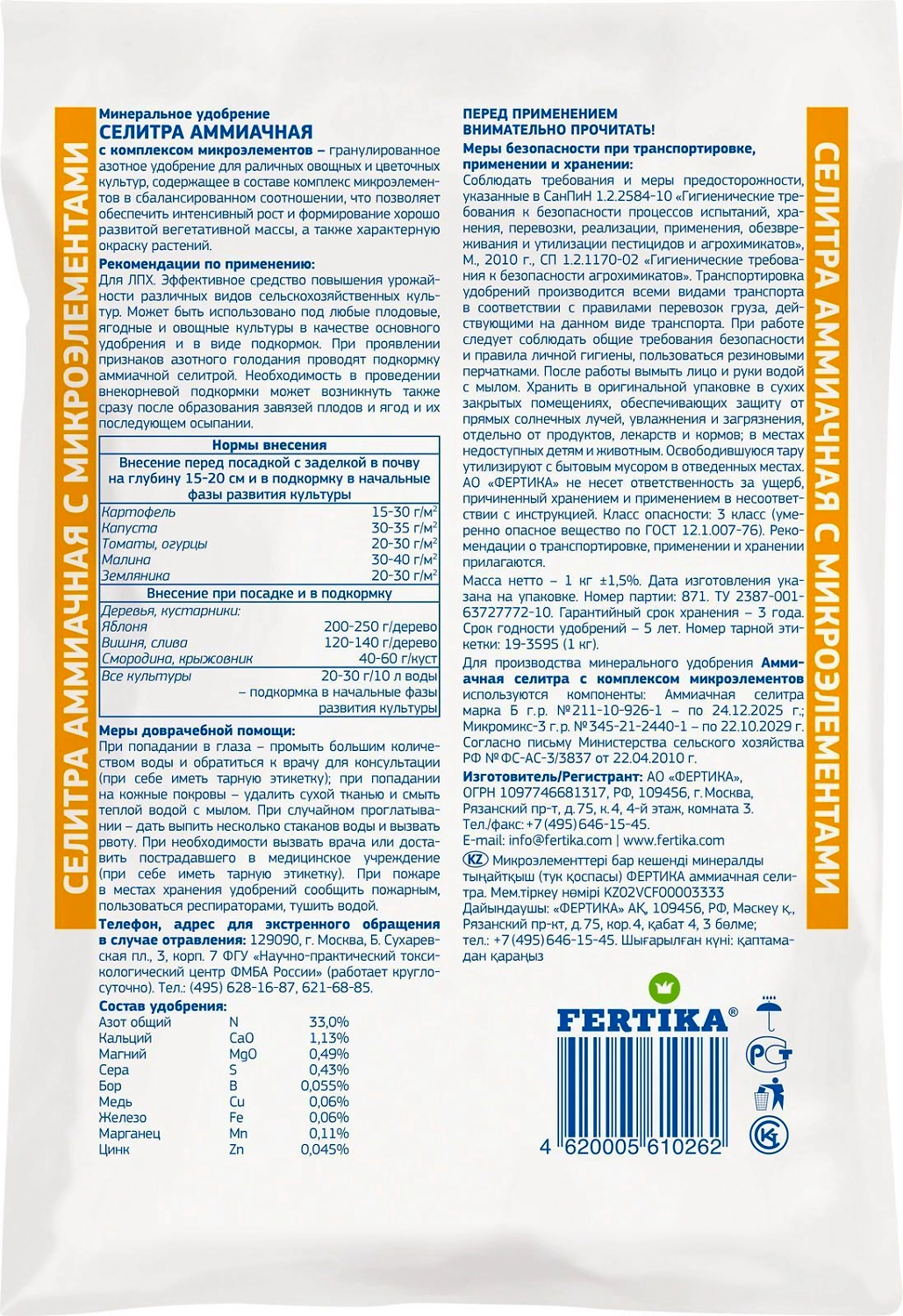 Удобрение Fertika Аммиачная селитра с комплесным микроэлементом.Унивесальное азотное удобрение.Хорошо растворяется в воде, может быть использовано в качестве основного удобрения и вввиде подкормок любых плодохых, ягодных и овощных культур.При появнении признаков азотного голодания проводят внекорневую подкормку. В качестве основного удобрения и вввиде подкормок любых плодохых, ягодных и овощных культур. Вес: 1 кг.