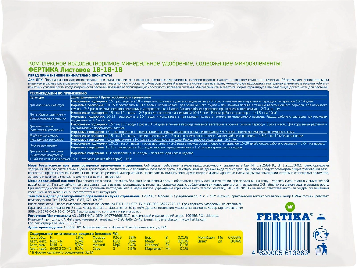 Полностью водорастворимое комплексное удобрение (NPK 18:18:18 + 1,4 MgO+МИКРОЭЛЕМЕНТЫ). Предназначено для использования при выращивании всех овощных, цветочно-декоративных, плодово-ягодных культур в открытом грунте и в теплицах. Микроэлементы.
