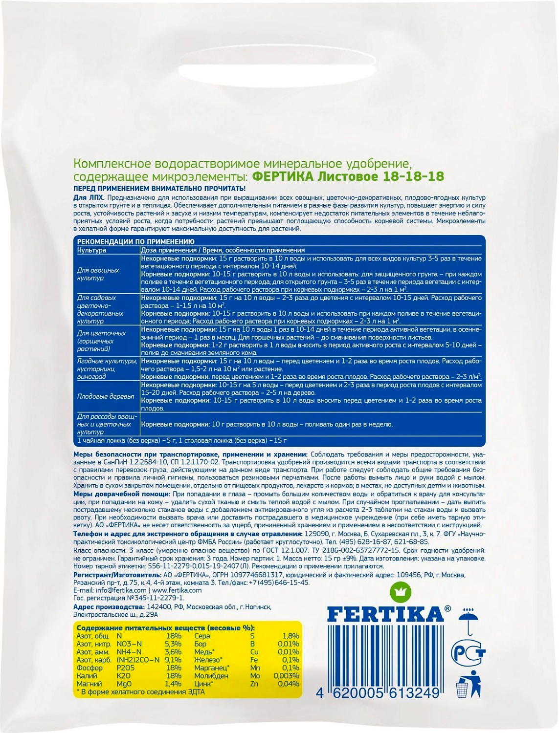 Полностью водорастворимое комплексное удобрение (NPK 18:18:18 + 1,4 MgO+МИКРОЭЛЕМЕНТЫ). Предназначено для использования при выращивании всех овощных, цветочно-декоративных, плодово-ягодных культур в открытом грунте и в теплицах. Микроэлементы