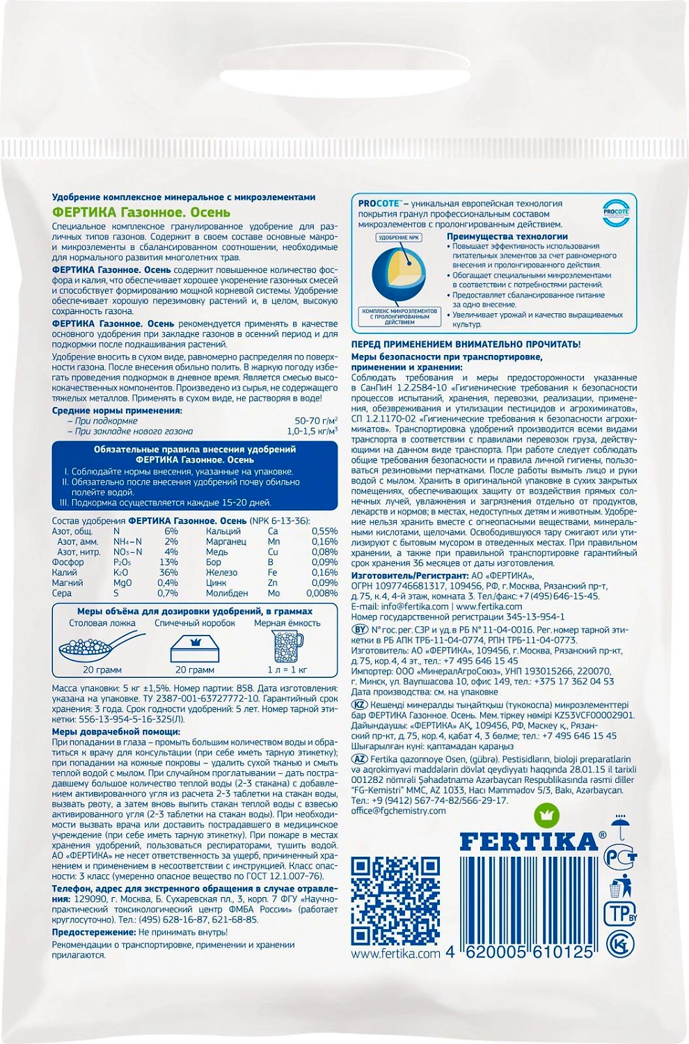 FERTIKA Осень - комплексное гранулированное удобрение для газона пролонгированного действия. Состав оптимально сбалансирован по макро- и микроэлементам для хорошего укоренения травы и высокой сохранности газона при перезимовке.