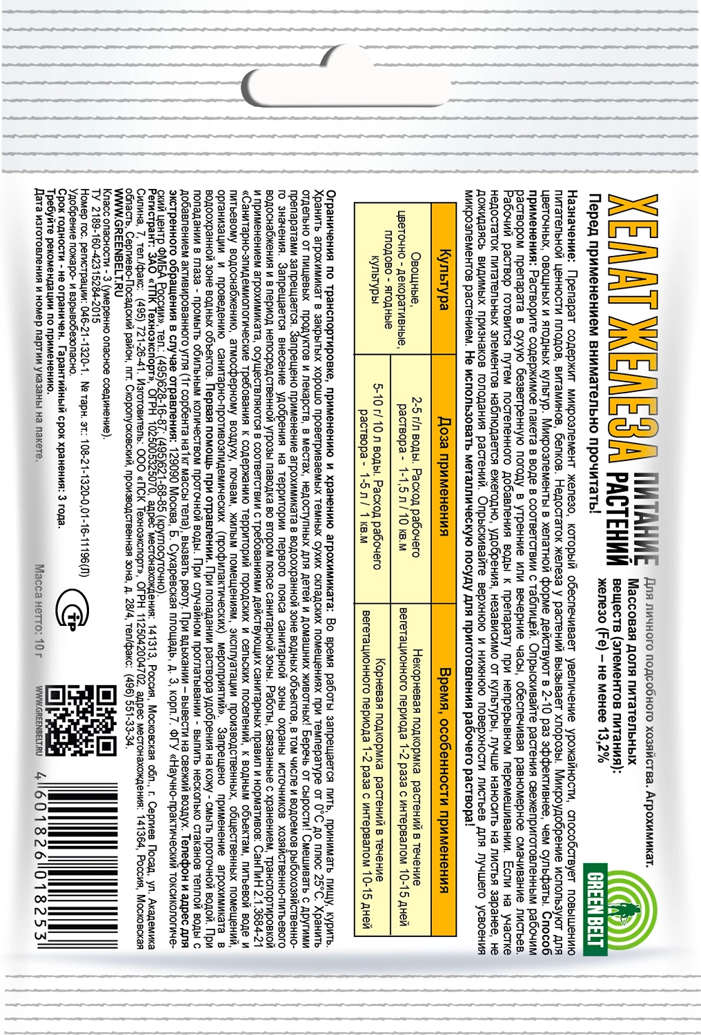 Препарат содержит микроэлемент железо, который обеспечивает увеличение урожайности, способствует повышению питательной ценности плодов, витаминов, белков. Недостатки железа у растений вызывает хлорозы. Микроудобрение используют для цветочных, ягодных и овощных культур.
