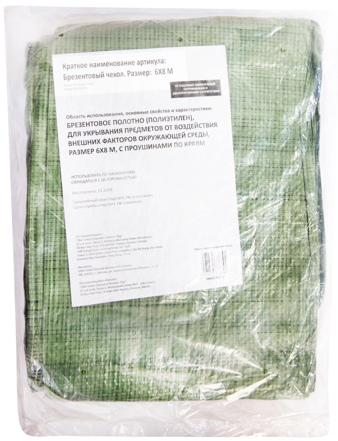 Брезентовое полотно (полиэтилен), для укрывания предметов от воздействия внешних факторов окружающей среды, размер 6х8 м, с проушинами по краям.