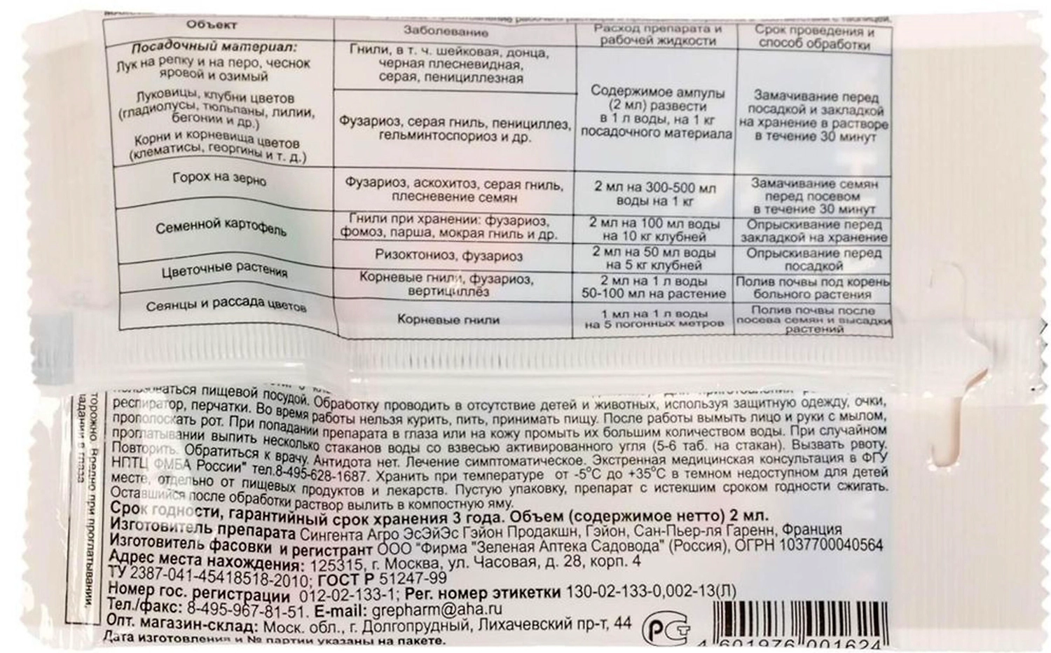 Создает защитный барьер на поверхности посадочного материала и в прикорневой зоне в почве.