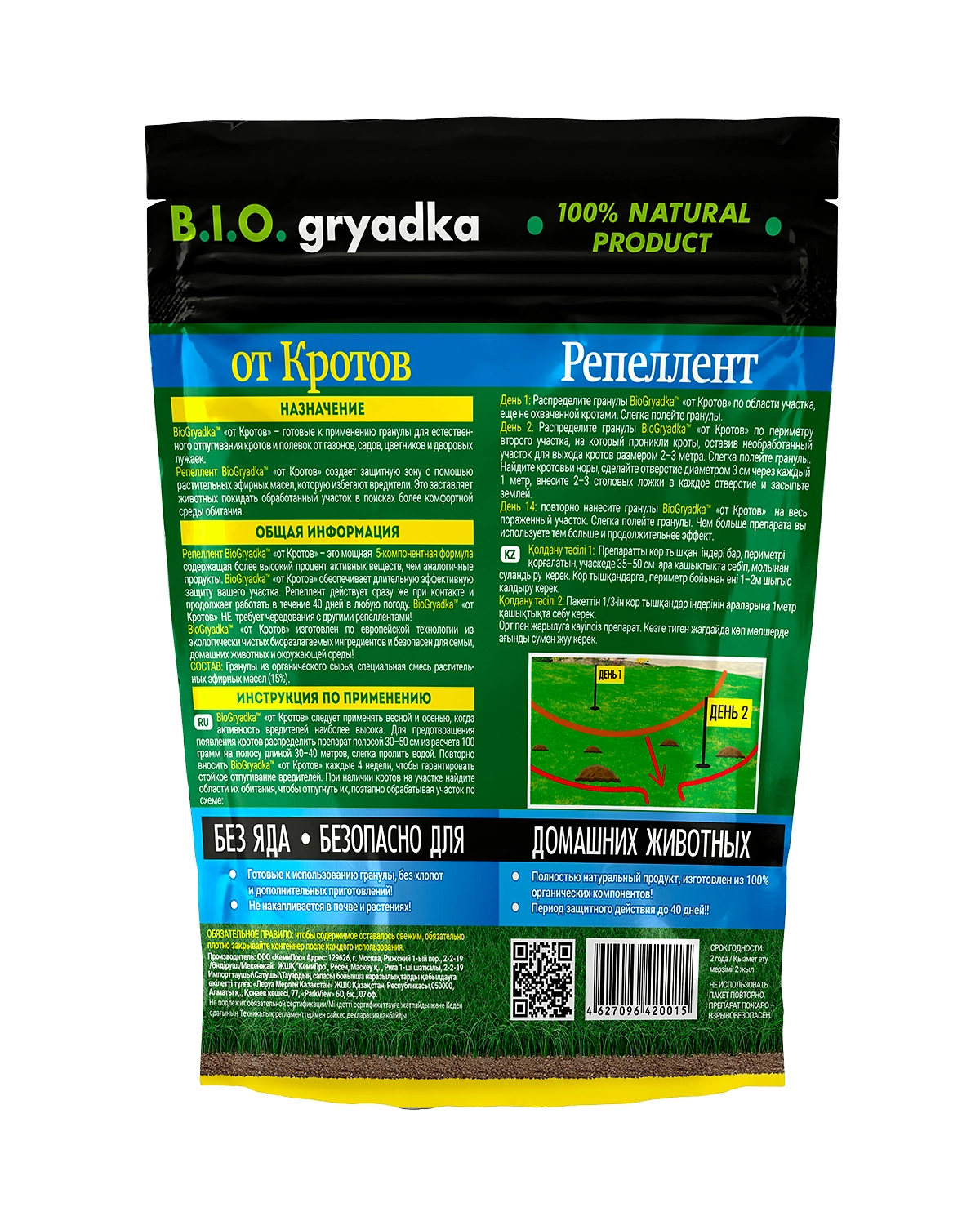 Средство от кротов "Биогрядка" отпугивающего принципа действия. Содержи в своем составе комплекс эфирных масел, препятствующих своим запахом проникновению кротов на ваш участок.