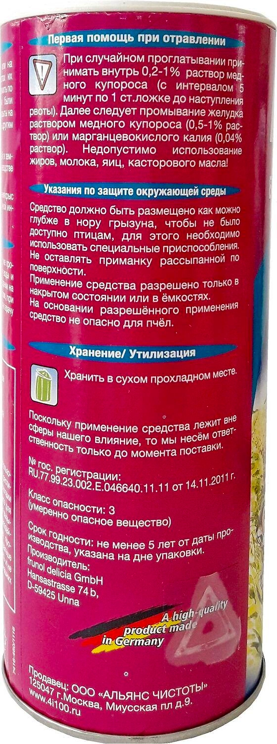 Готовая к применению быстродействующая зерновая приманка специально разработана для целенаправленной борьбы с полевыми мышами и другими грызунами в земледелии, овощеводстве и растениеводстве, а также на лугах и пастбищах. Действующее вещество не вредит растениям. Разрешено применение в доме и саду. Одной упаковки средства достаточно для быстрого уничтожения мышей на площади 250 кв.м. Удобная для применения герметичная упаковка.