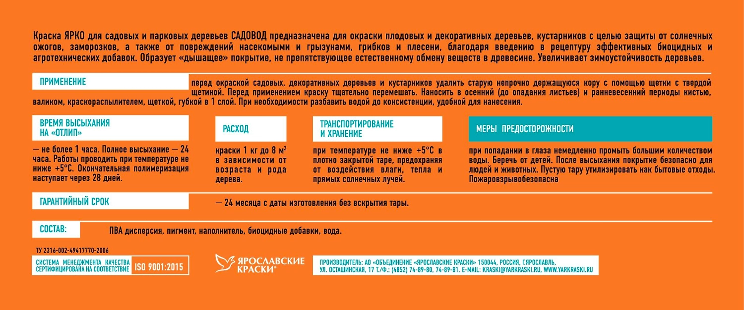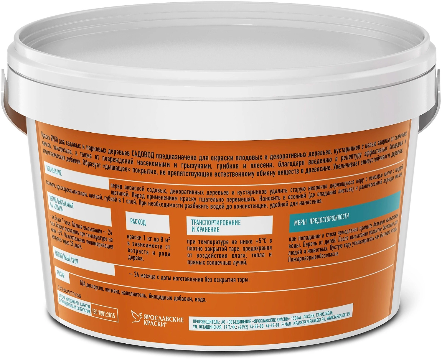 Быстросохнущая краска САДОВОД торговой марки ЯРКО предназначена для окраски плодовых и декоративных деревьев, кустарников с целью защиты от солнечных ожогов, заморозков, грибков и плесени, а также от повреждений насекомыми и грызунами. Благодаря введению в рецептуру эффективных биоцидных и агротехнических добавок образует «дышащее» покрытие, которое не препятствует естественному обмену веществ в древесине. Увеличивает зимоустойчивость деревьев.