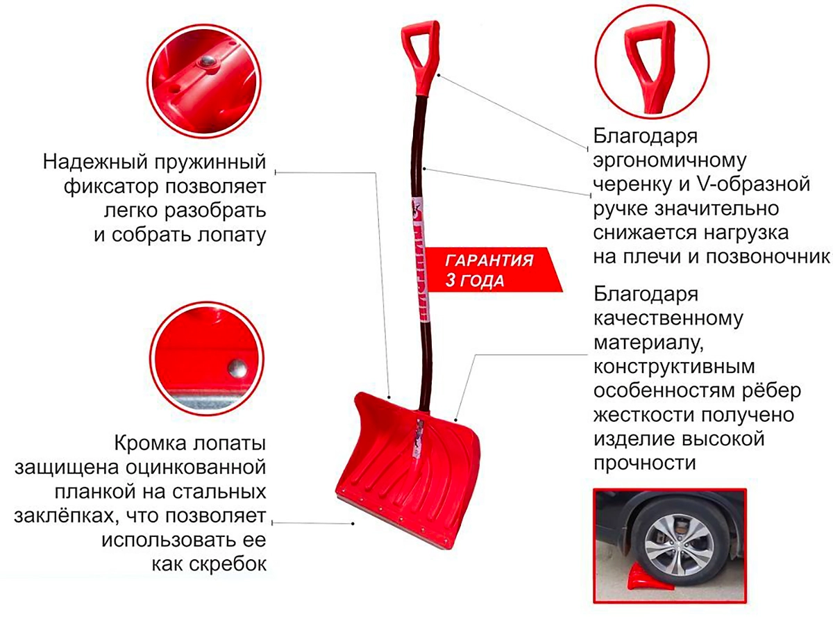 Ковш лопаты выполнен из первичного блоксополимера пропилена спец. марки с ребрами жесткости, что позволило добиться прочности и износостойкости изделия. Используемый суперконцентрат "Красный" придает приятный внешний вид лопате. Кромка лопаты защищена спец. стальной профильной планкой, приклепанной стальными заклепками, покрытыми никелем. Высокая прочность лопаты и наличие крепкой и надежно прикрепленной планки позволяет использовать лопату в качестве скребка. Поверхность лопатного ковша гладкая, за счет постоянного контроля за состоянием оснастки, что значительно снижает вероятность налипания снега.