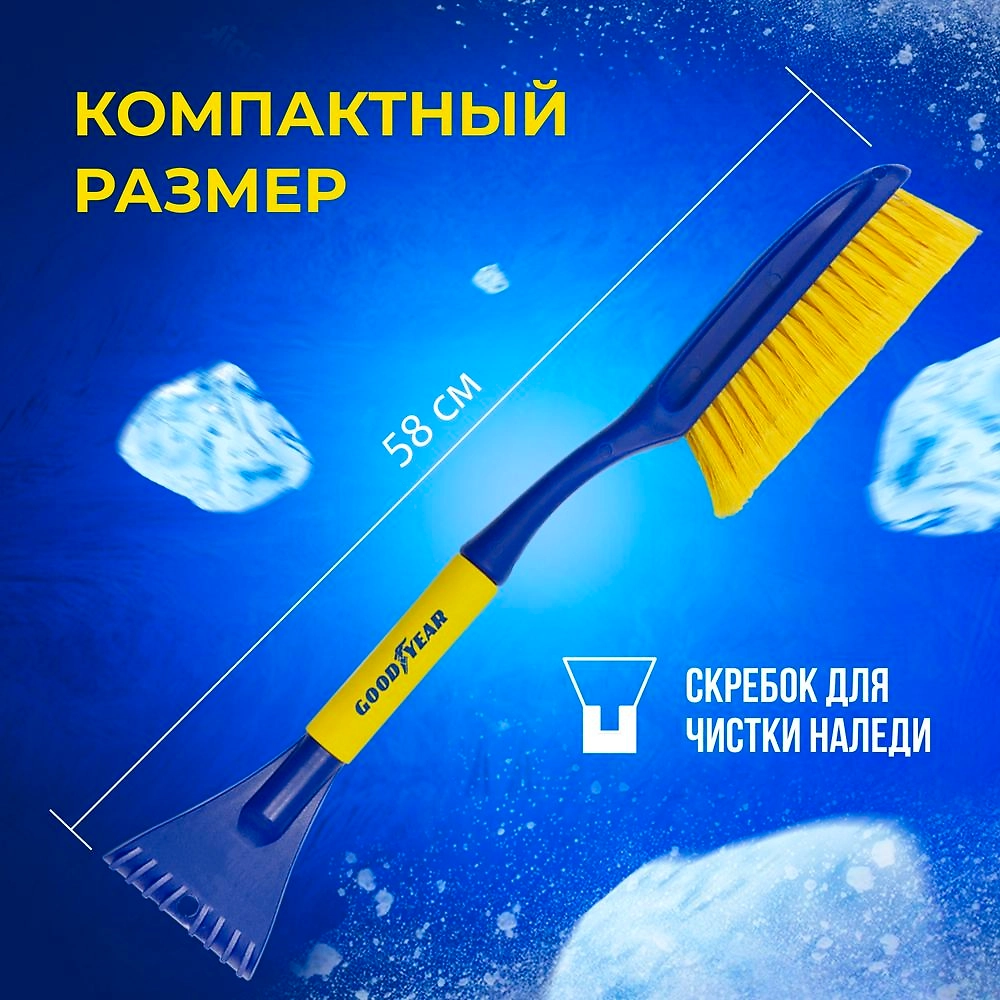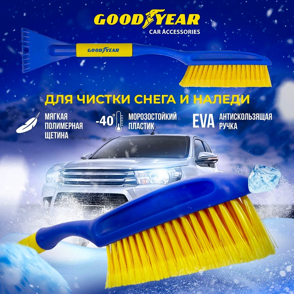 Удобная щетка Goodyear для удаления снега и льда с поверхности автомобиля. Щетка изготовлена с применением распушенной щетины, что позволяет бережно и эффективно очистить кузов и стекла от снега.