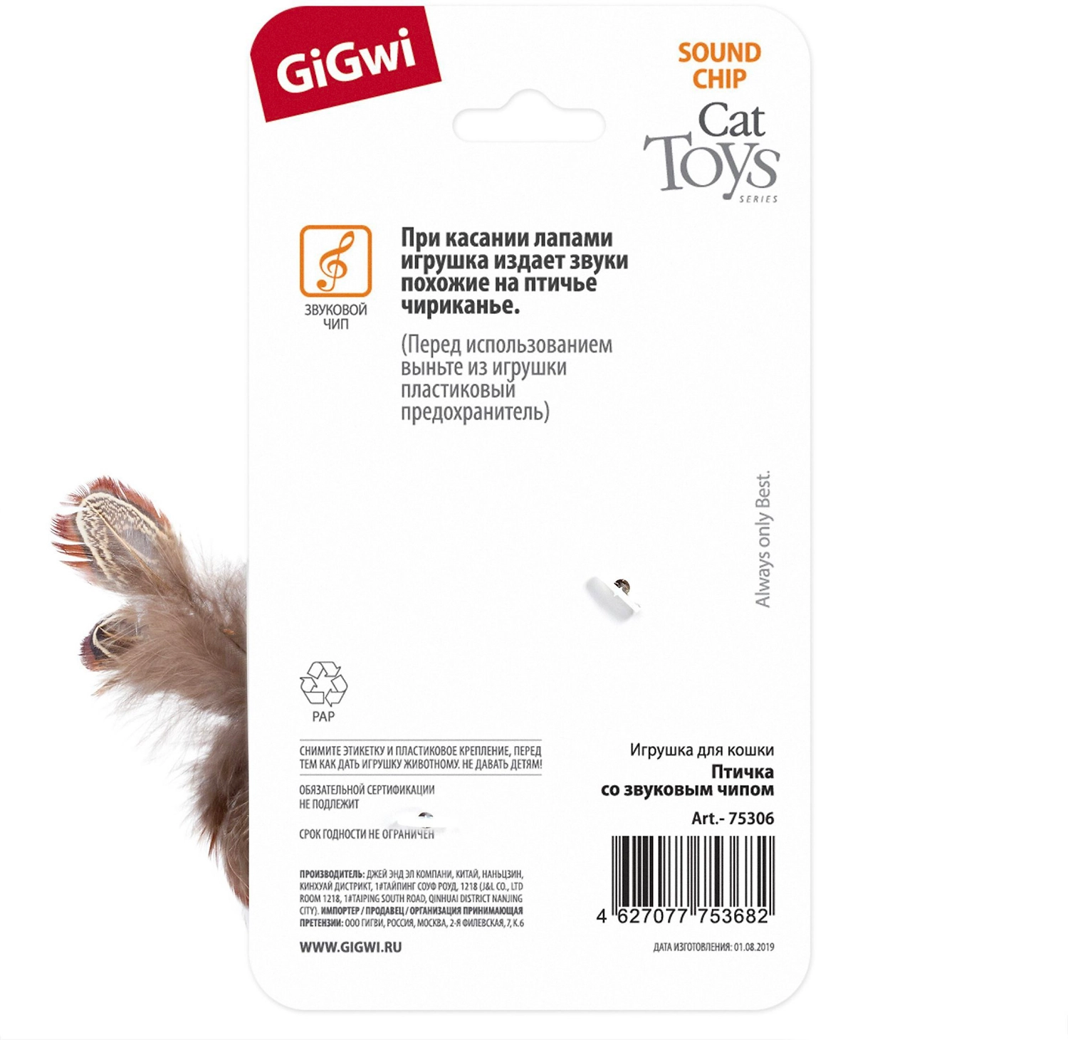 Игрушка для кошек GiGwi "Птичка со звуковым чипом", выполненная из текстиля, искусственного меха и пера, не позволит заскучать вашему пушистому питомцу.