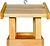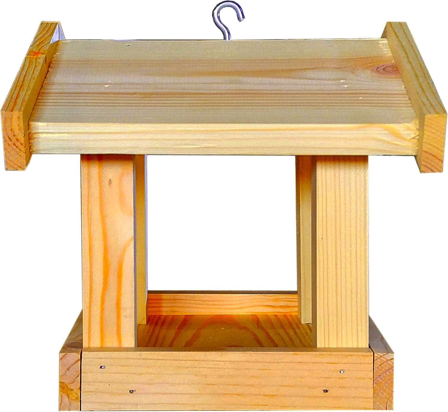Кормушка собрана и готова к использованию. Изделие представляет собой квадратный поддон размером 16х16 см с углублением для сыпучего корма глубиной 1 см, в углах поддона на столбиках сечением 2,5х2,5 см установлена стилизованная крыша для защиты от осадков. В среднюю точку конька крыши вкручен металлический крюк на резьбе для подвешивания изделия. Продажа без индивидуальной торговой упаковки.