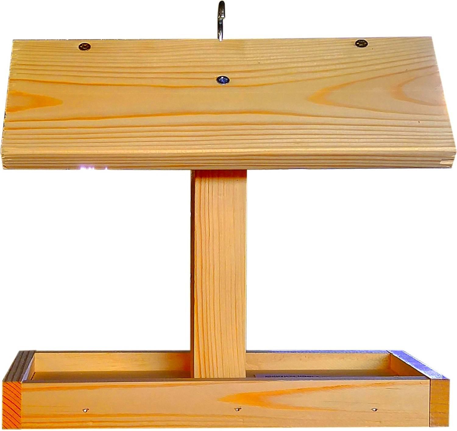 Кормушка собрана и готова к использованию. Изделие представляет собой поддон размером 20х16 см с углублением для сыпучего корма глубиной 2,5 см, над поддоном на шесте 3х4 см установлена крыша для защиты от осадков. В верхнюю точку кормушки (конёк крыши) вкручен металлический крюк на резьбе для подвешивания изделия. Фурнитура изделия – крюк, гвозди, шурупы – нержавеющая.