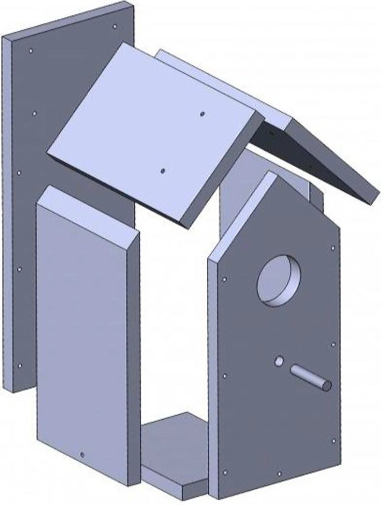 Сборка займет не больше 10-15 минут. В комплект входит 7 деталей: 2 боковые стенки, 2 крышных элемента, фронтальная стенка с отверстием-летком диаметром 5 см, задняя стенка с 2 отверстиями для подвешивания, дно и насест (жёрдочка). Гвозди для сборки (2х40мм, 24 шт.) в комплекте. В инструкции по сборке содержится подробная схема разметки деталей, описание процесса сборки, 3D схема ориентации деталей в изделии и основные правила безопасного размещения скворечника. Для сборки необходим молоток, карандаш и линейка. Для точной сборки рекомендуется использовать сверло 2 мм. Толщина доски – 15 мм.