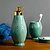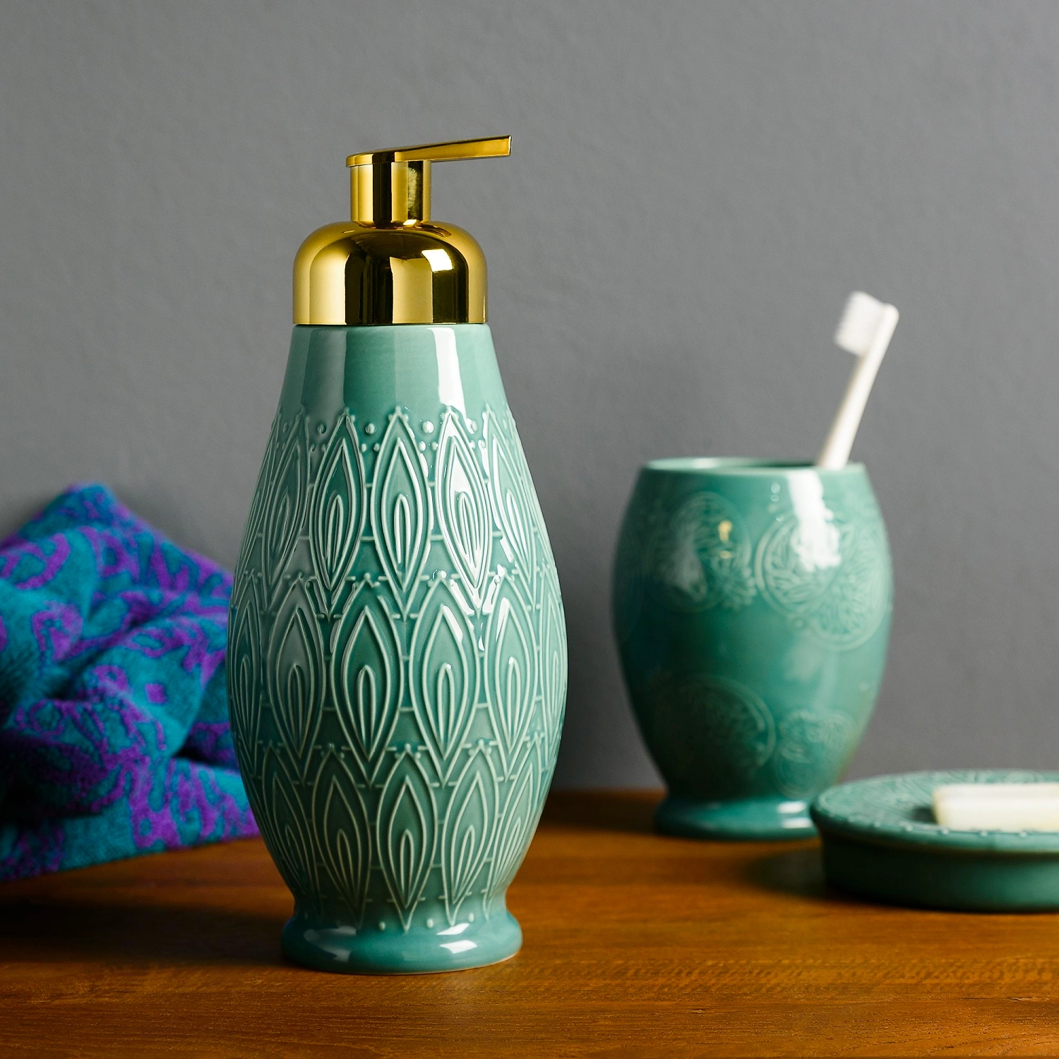 Керамический дозатор для жидкого мыла зелёного цвета с орнаментом в виде листьев. Имеет размер 23x10 см.