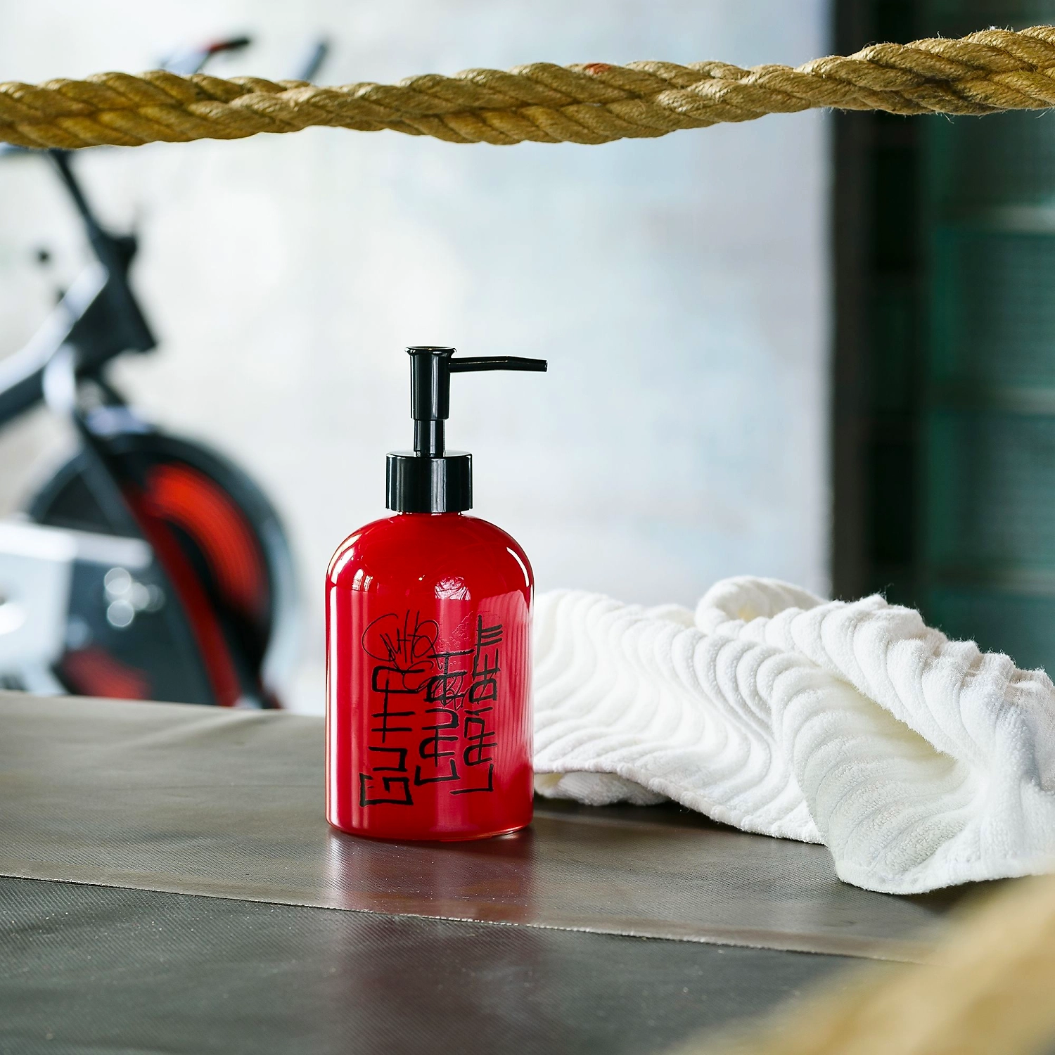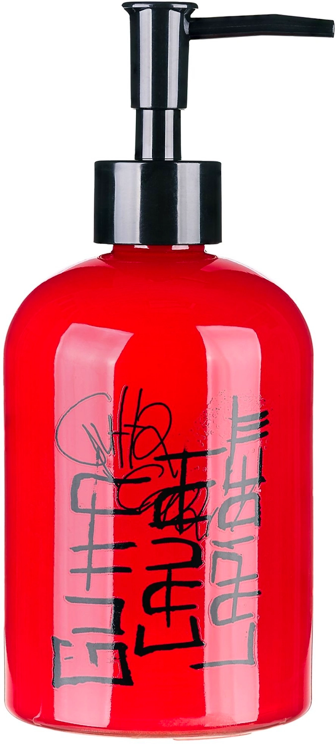 Дозатор для жидкого мыла красного цвета объёмом 500 мл. Основа изделия изготовлена из прочного стекла, а верхний наконечник - из пластмассы. Дозатор может использоваться для хранения не только жидкого мыла, но также шампуней, гелей для душа и других косметических средств. На внешней части аксессуара есть принт в виде надписей и рисунков, напоминающих граффити, это делает его отличным дополнением ко всем элементам одноимённой коллекции Graffity.
