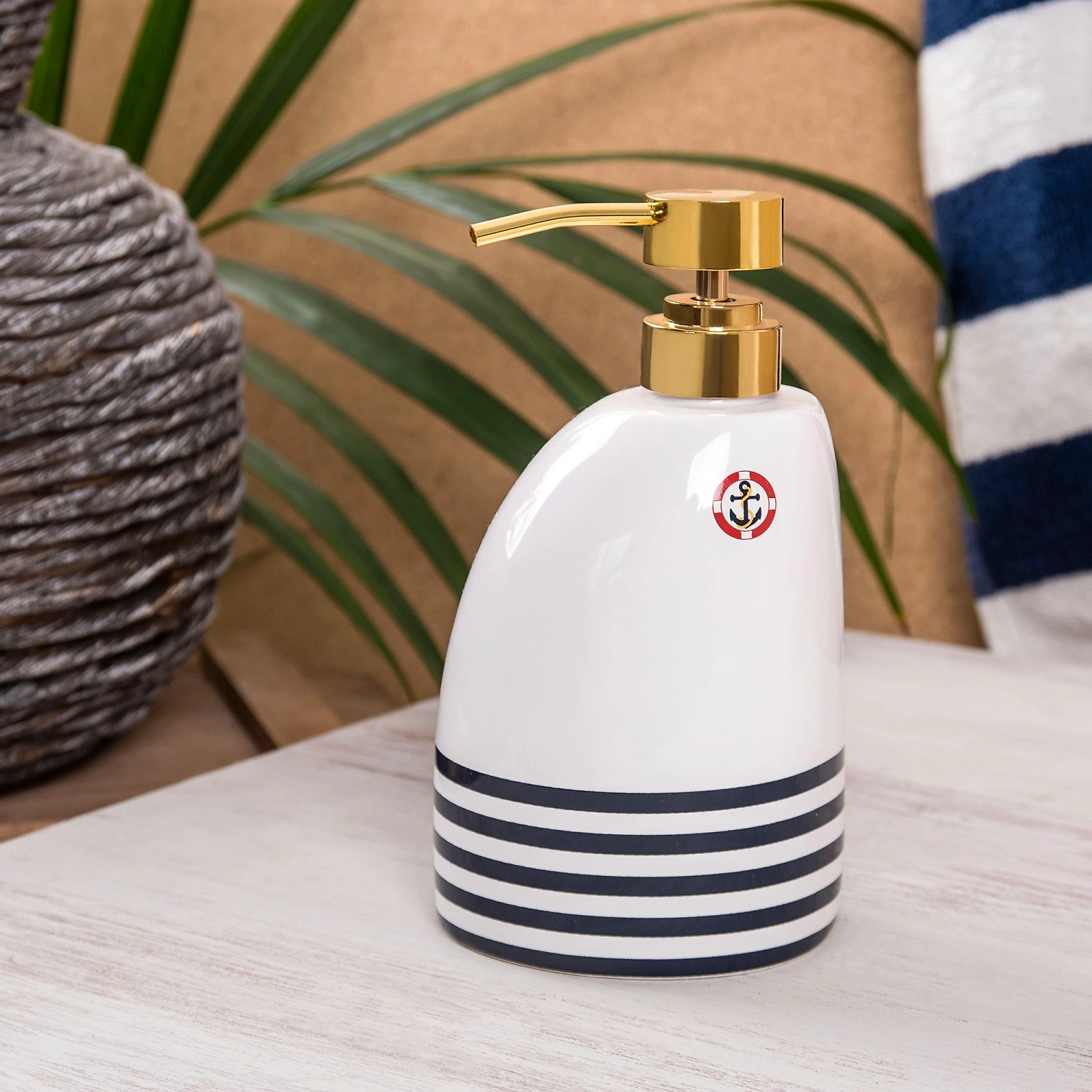 Дозатор для жидкого мыла имеет необычную форму и принт в морской тематике, который отлично сочетается с золотистыми элементами. Рисунок на керамике нанесен по технологии деколь.
