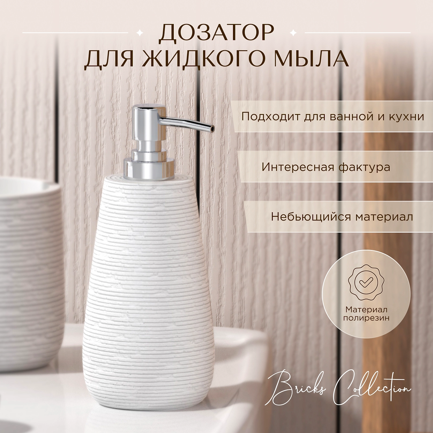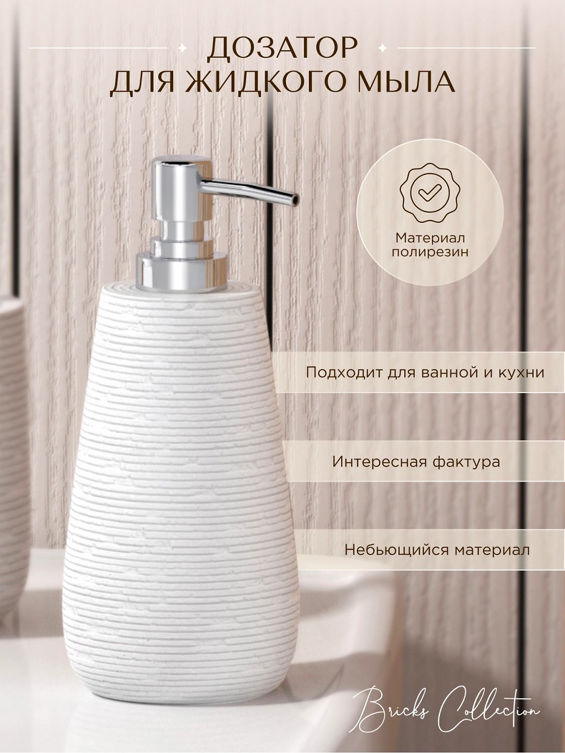 Дозатор для жидкого мыла настольный BRICKS WHITE производителя Fora выполнен из прочного полирезина и качественного пластика. Легкий в уходе и стойкий к влажности материал позволяет изделию служить долгие годы. Дозатор помогает экономно расходовать моющее средство, а благодаря стильному дизайну в белом цвете отлично вписывается в интерьер современной ванной комнаты.