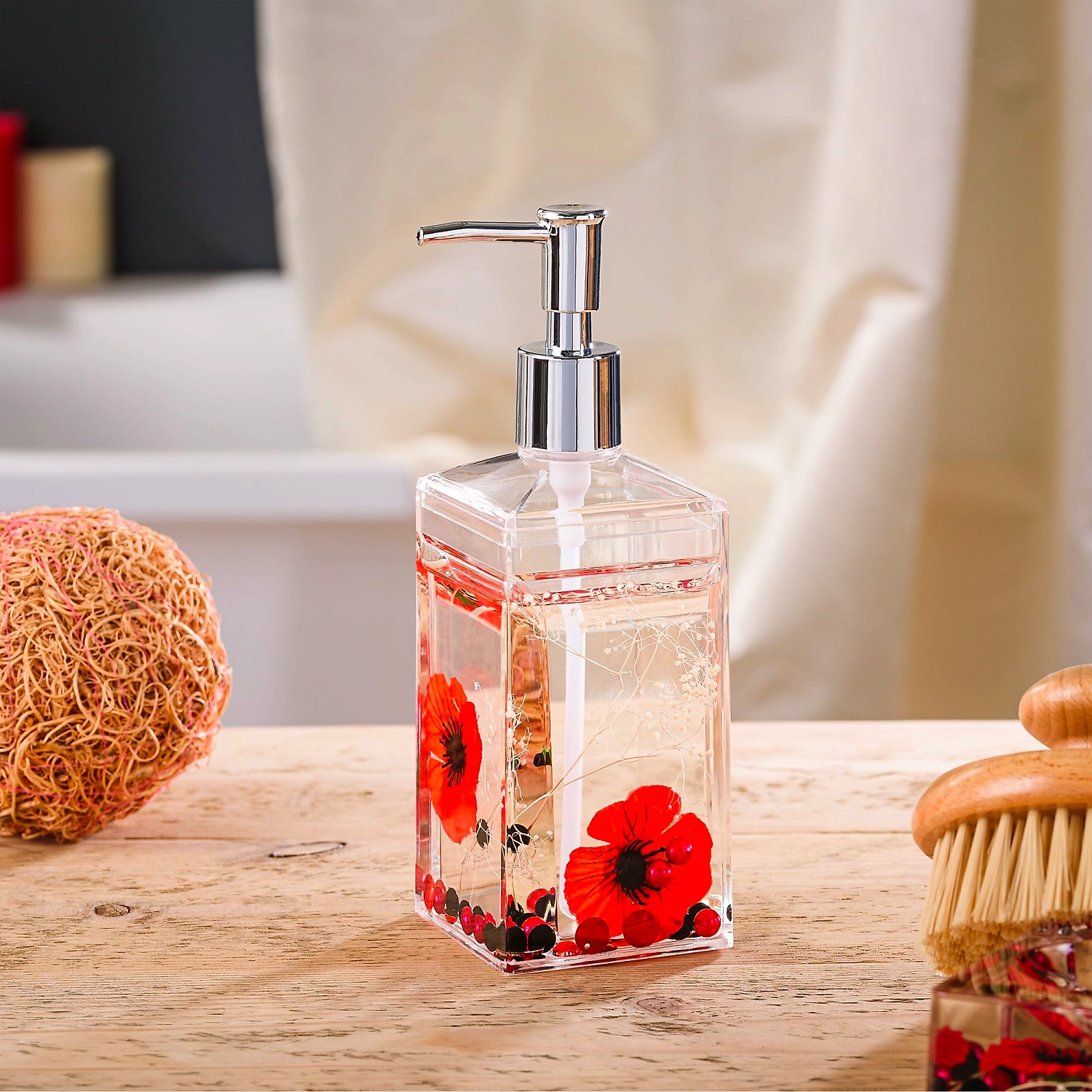 Алый мак, использованный для украшения данной модели, выглядит необычайно ярко и привлекательно. Этот дозатор для жидкого мыла станет центром интерьерной композиции и добавит в нее красок.