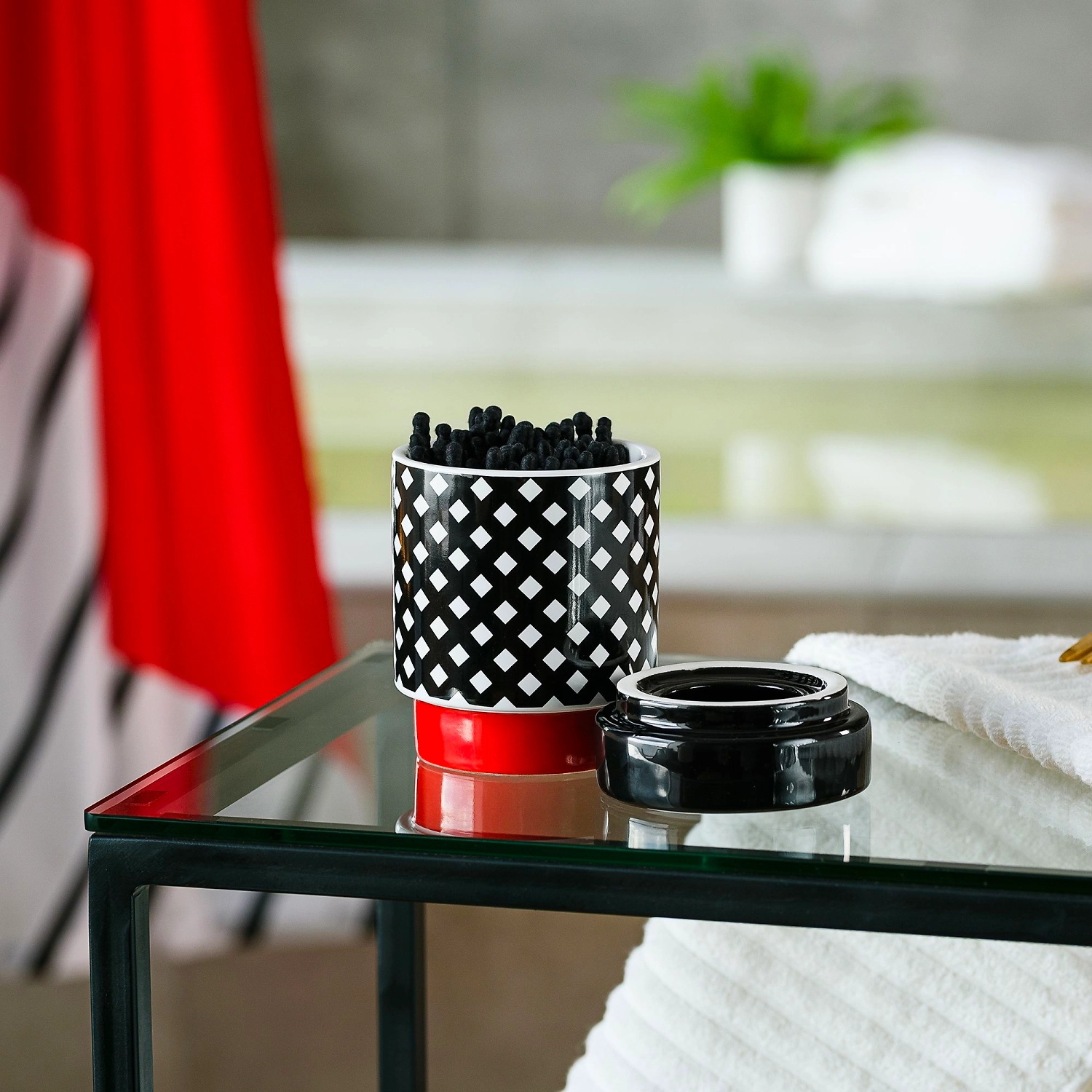 Керамический контейнер для ватных дисков с геометрическим узором. Объем: 350 мл, диаметр: 5,5 см, высота: 12 см. Подойдёт для хранения не только ватных дисков, но и ватных палочек, украшений, различных мелочей и небольших приспособлений. Станет частью интерьера, выполненного в авангардном стиле коллекции Memphis, и будет гармонично дополнять другие аксессуары из этой линейки.