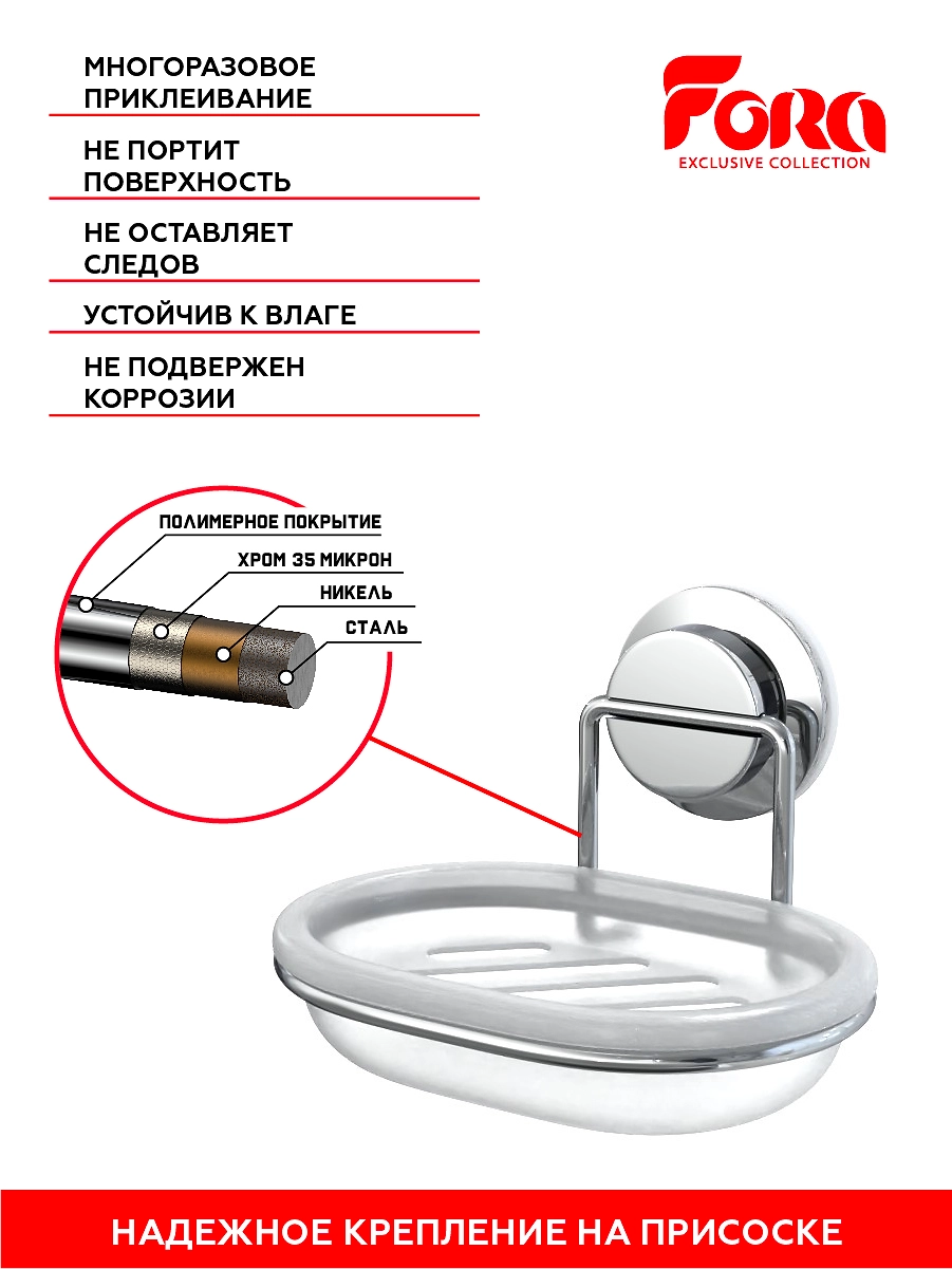 Мыльница есть в каждом доме, где пользуются твердым мылом. Однако иногда она доставляет массу неудобств, соскальзывая с края мойки или отклеиваясь от стены. Решить эту проблему поможет мыльница на присоске Fora "ATLANT". Она имеет классическую овальную форму и крепится к стене при помощи вакуумной присоски из натурального каучука.