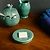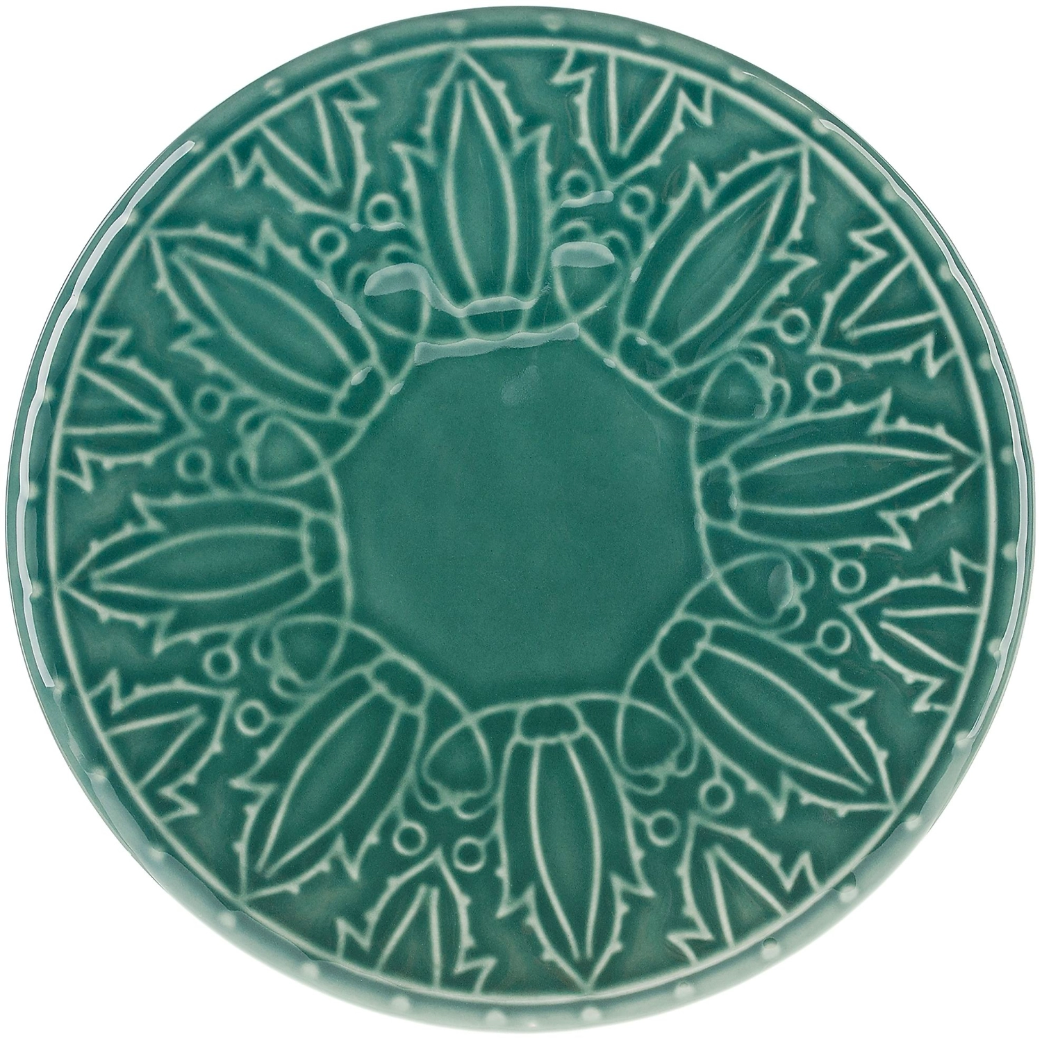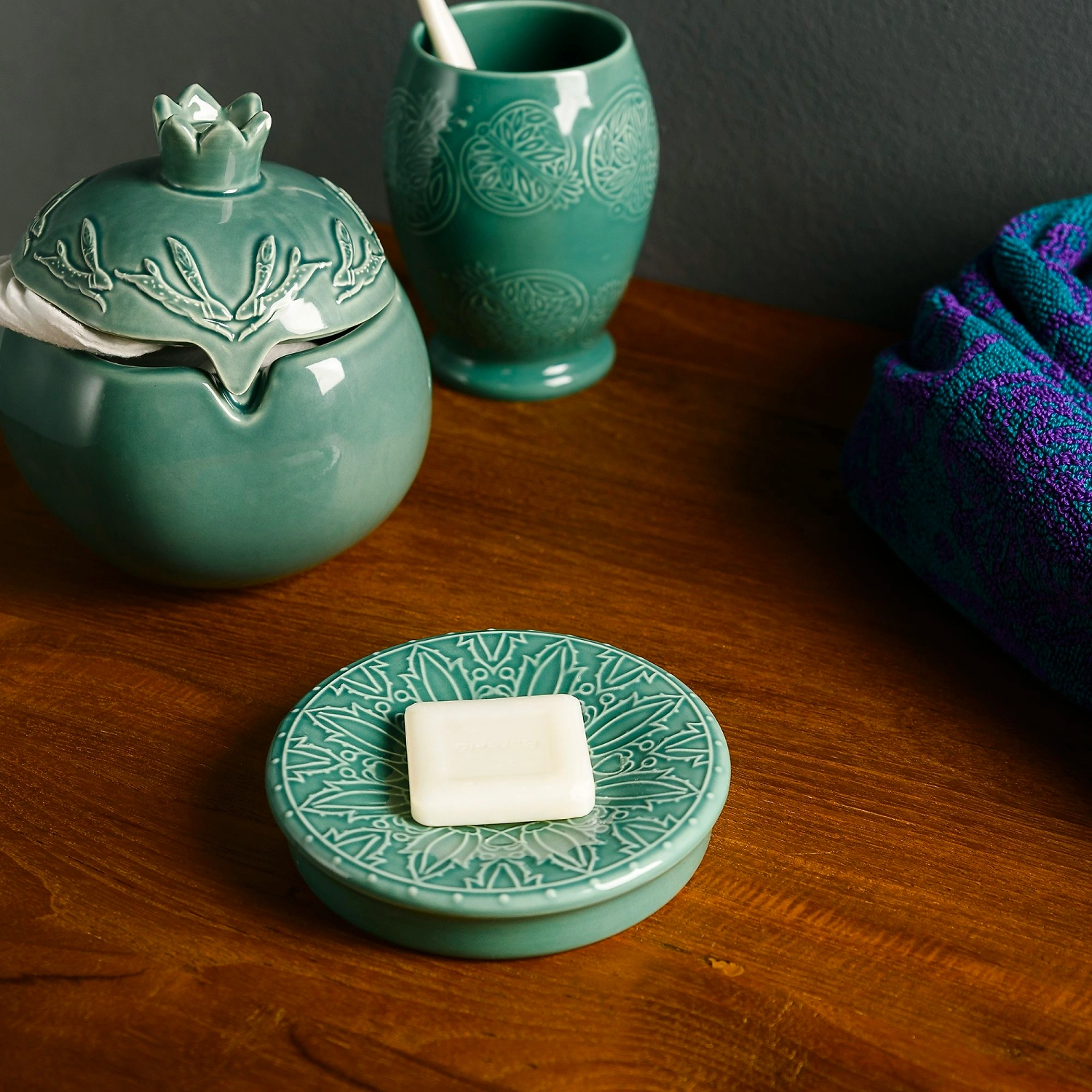 Керамическая мыльница зелёного цвета с объёмным рисунком. Имеет размер: 12 см в диаметре, 2,5 см в высоту. Подойдёт для размещения кускового мыла различной формы.