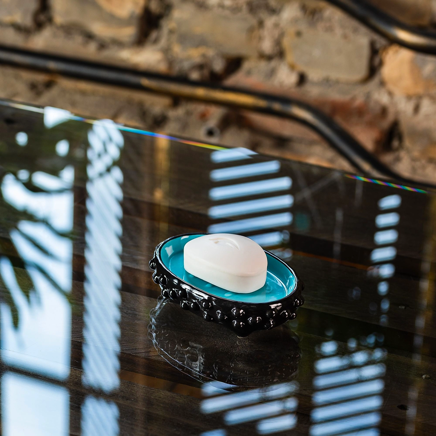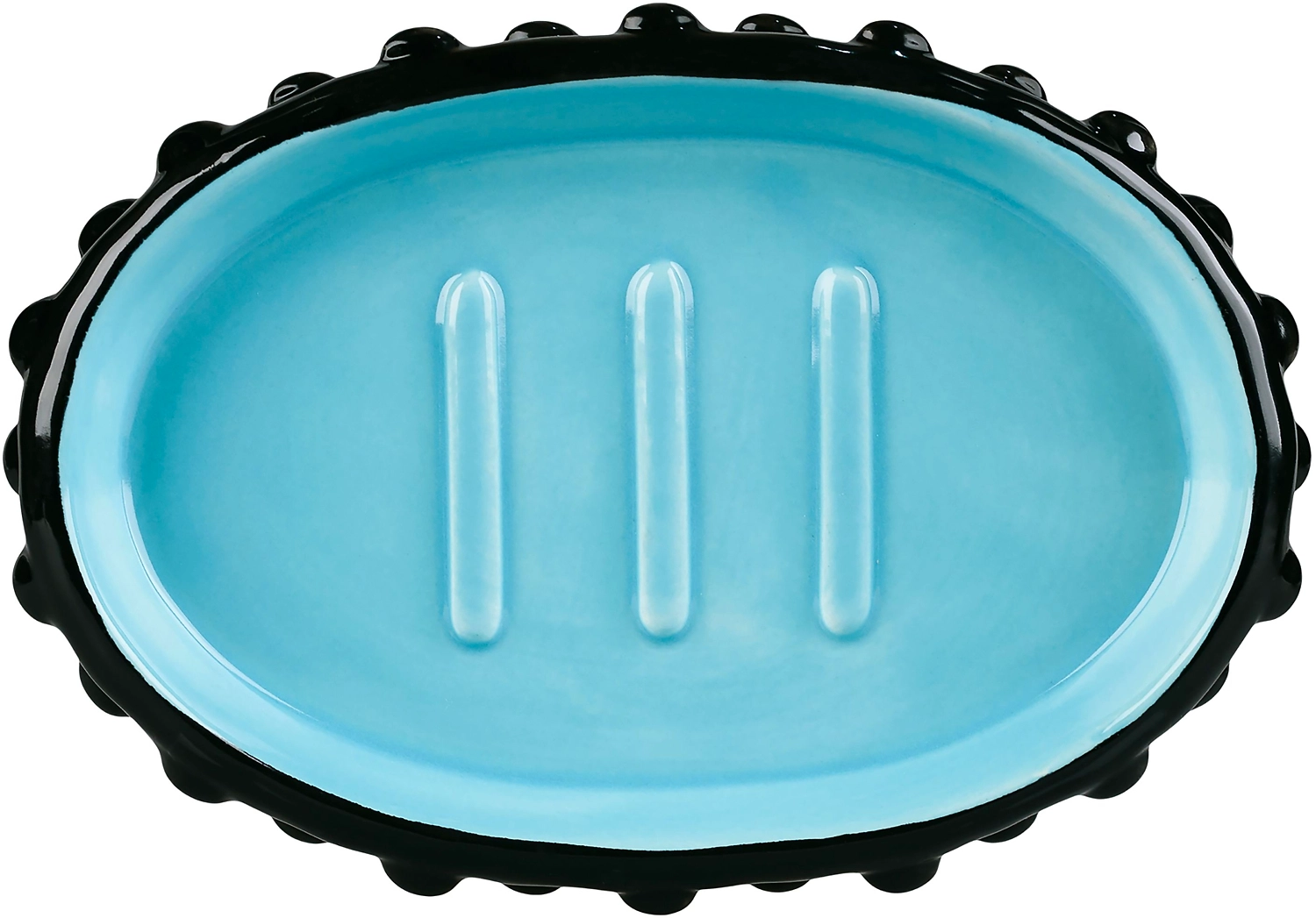 Овальная керамическая мыльница черно-берюзового цвета 14,5х9,5х4 см. Удобная форма гарантирует устойчивость изделия.