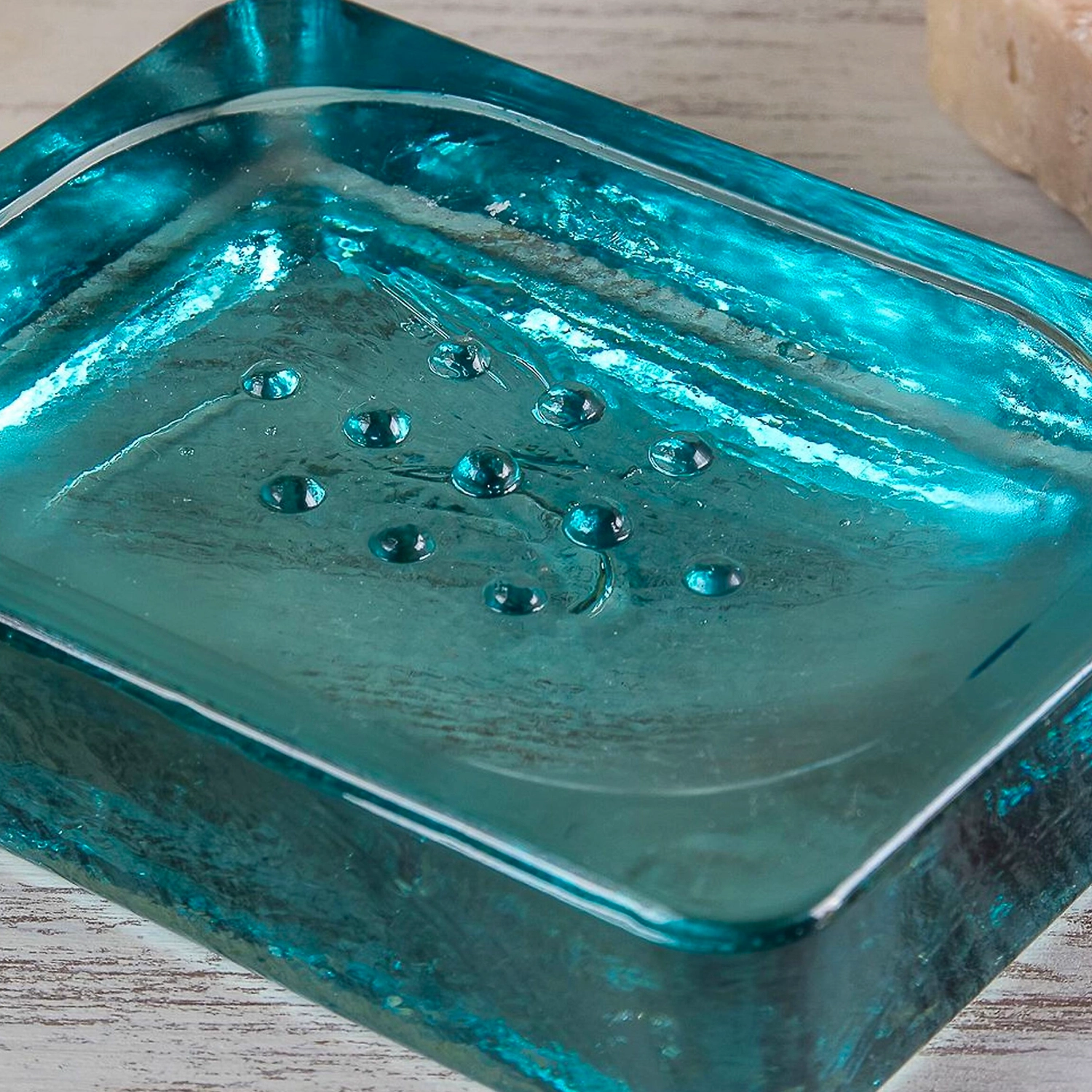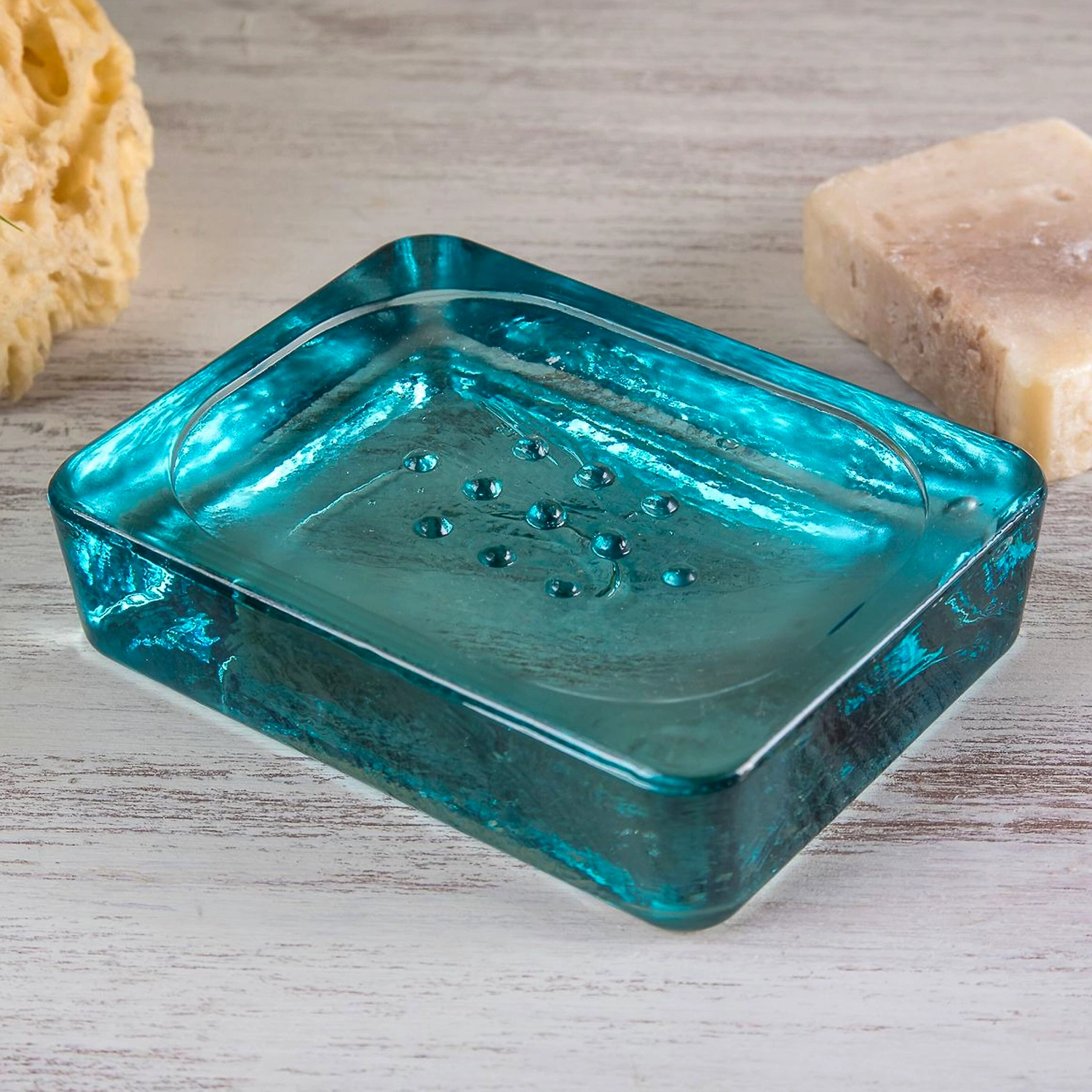 Массивная мыльница из переработанного стекла выглядит брутально и очень стильно. Данная модель будет хорошо смотреться в интерьерах в стиле хай-тек и лофт.