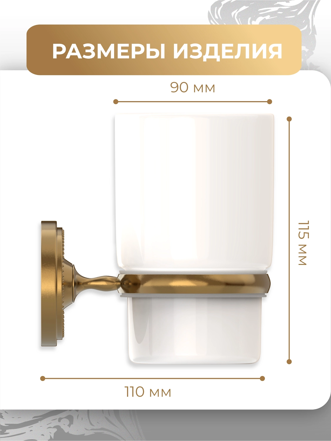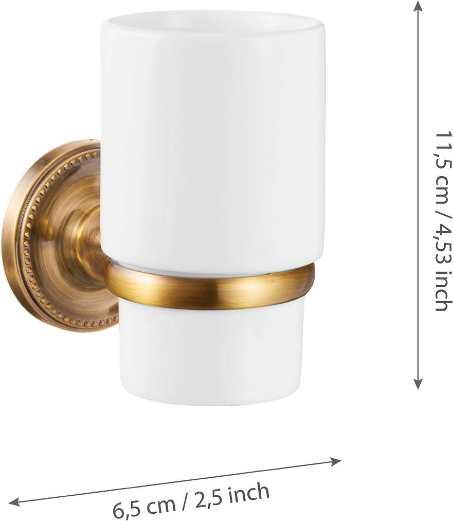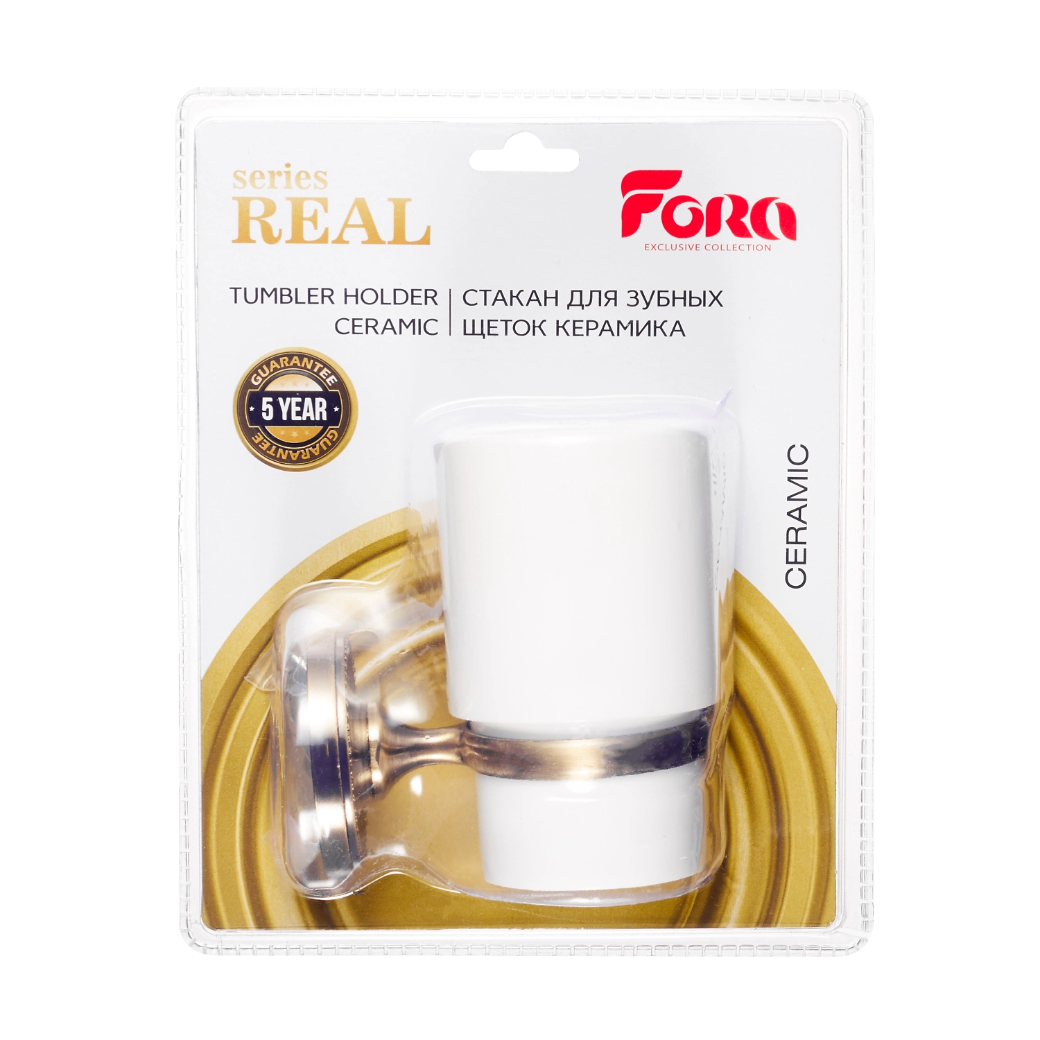Настенные аксессуары для ванной – отличный способ разместить необходимые предметы личной гигиены, когда около раковины нет полочек. Молочно-белый керамический стакан «REAL» FORA в классическом дизайне впишется в любой современный интерьер. Металлическое крепление с высокопрочным покрытием бронзового оттенка – эффектно дополняет аксессуар и надежно удерживает его на стене.