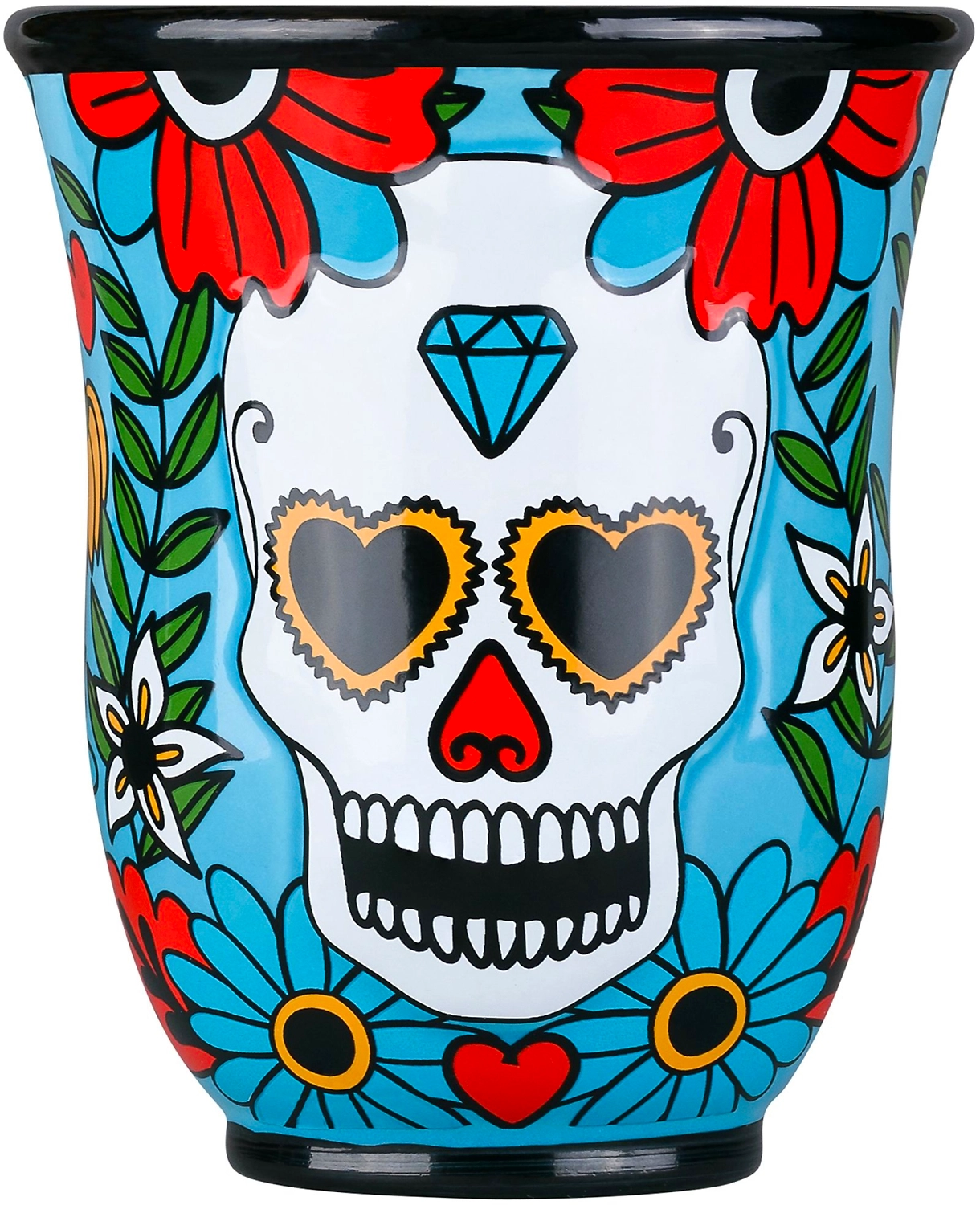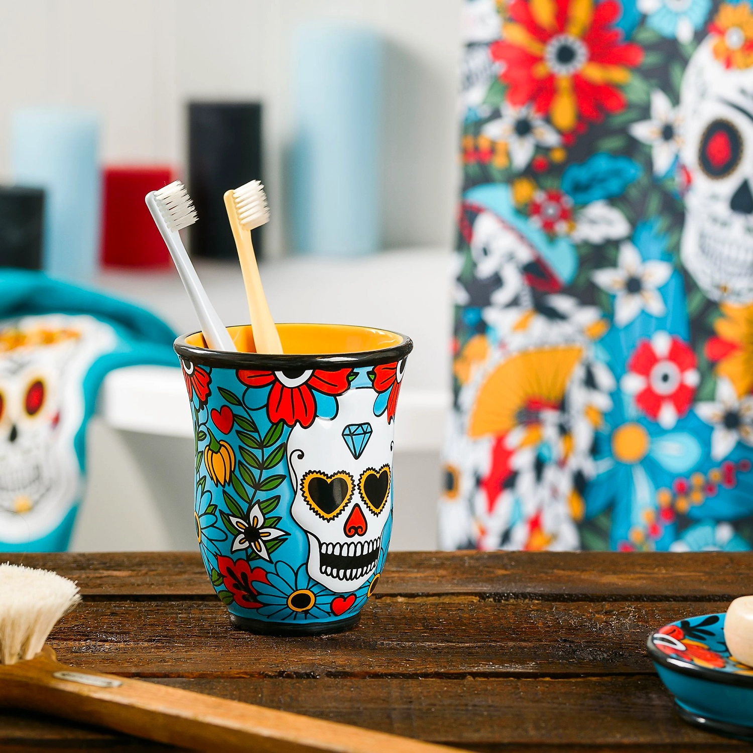 Керамический стакан для зубных щеток. Устойчивая модель с широким верхом позволяет хранить в стакане несколько зубных щеток. Стакан стилизован под известный мексиканский праздник День Мертвых.