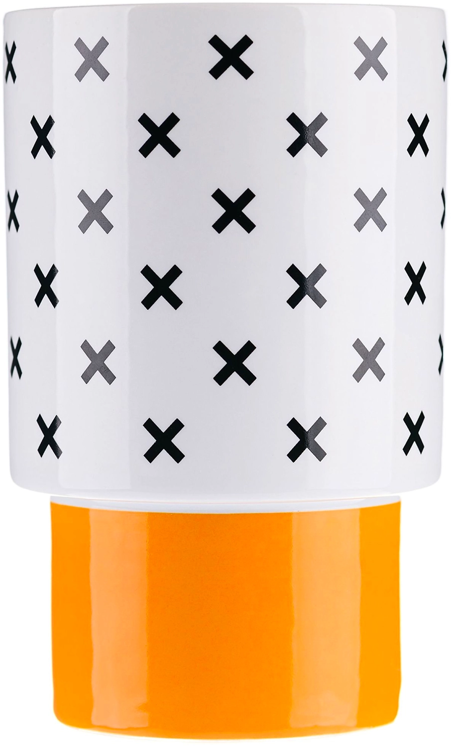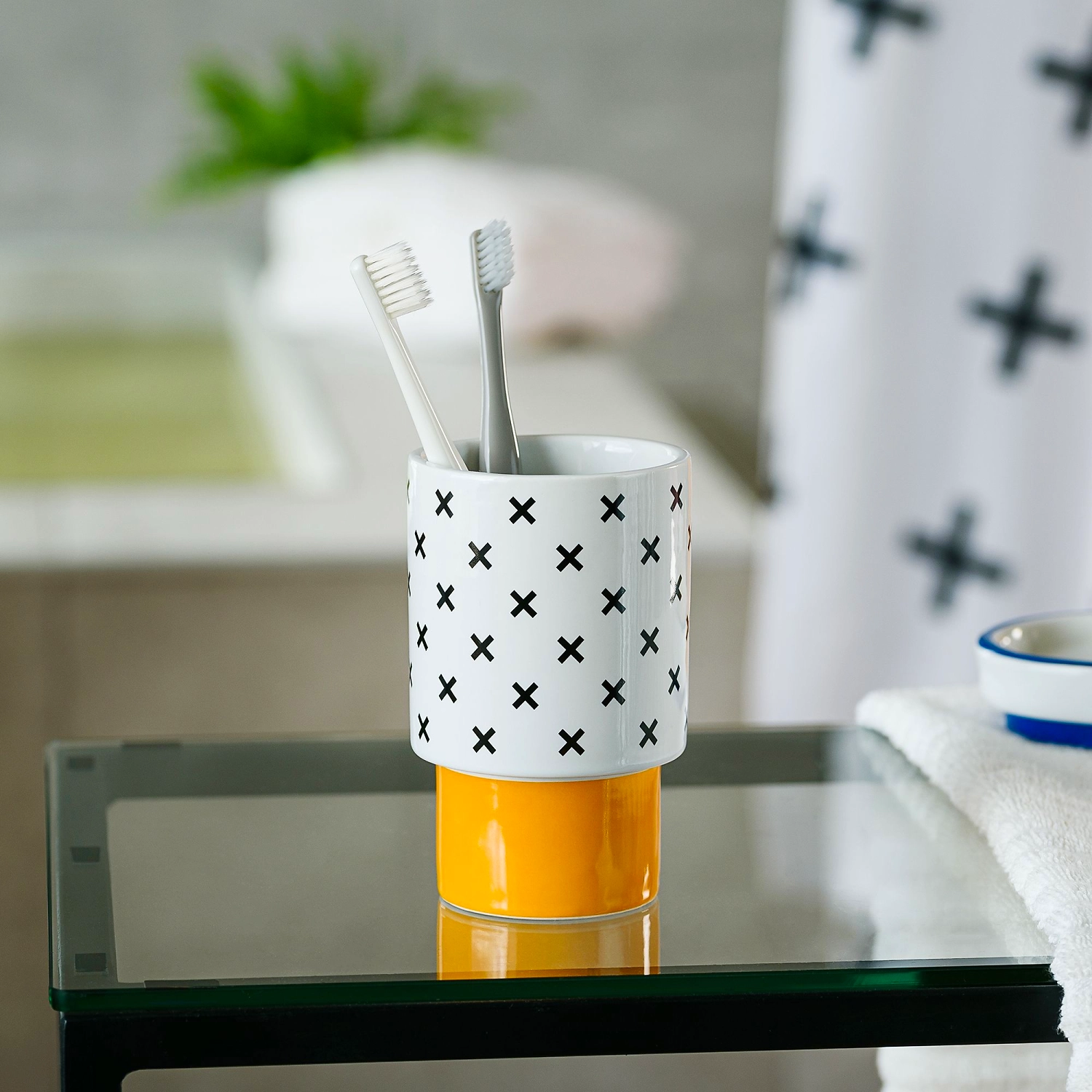 Керамический стакан для зубных щёток белого цвета с оригинальным рисунком. Диаметр: 7,5 см, высота: 12 см Предназначен для хранения одной или нескольких зубных щёток и тюбика с пастой. Сочетание белого, чёрного и жёлтого цвета и авангардный узор на внешней части стакана прекрасно гармонируют с аксессуарами из коллекции Memphis: шторами для ванной, дозаторами, мыльницами и другими.
