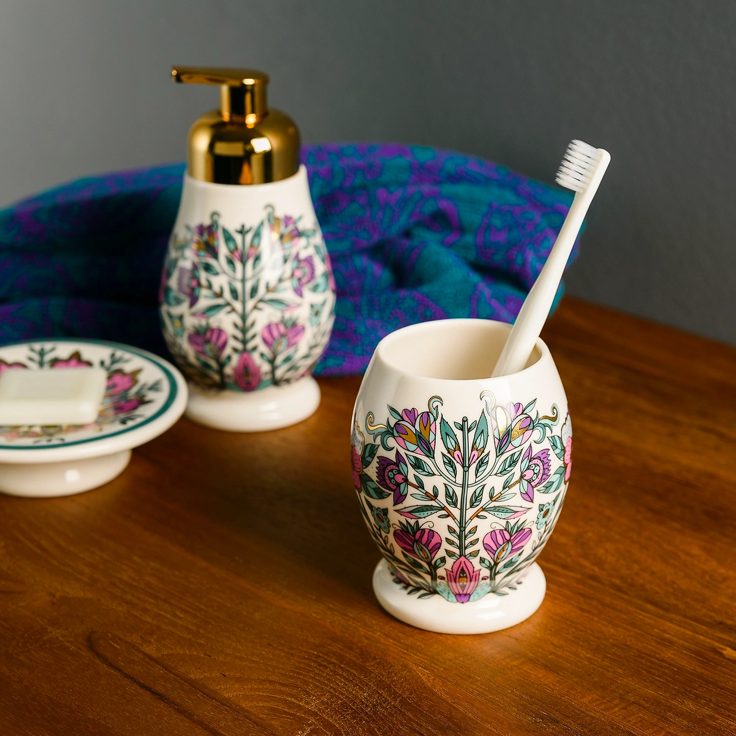 Керамический стакан для зубных щёток с ярким орнаментом. Имеет размер: 6,2 см в диаметре, 10 см в высоту. Подойдёт для хранения одной или нескольких зубных щёток и тюбика с пастой. Внешняя сторона изделия украшена узором в виде необычных растений, что позволяет ему стать прекрасным дополнением к аксессуарам из сказочной коллекции Fairytale: полотенцам, коврикам, занавескам для душа и другим элементам.