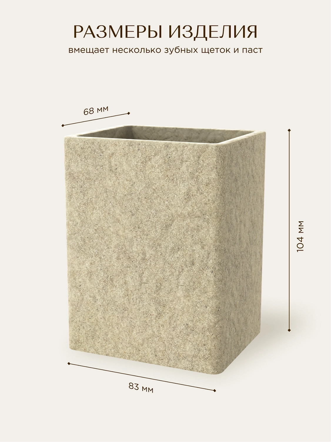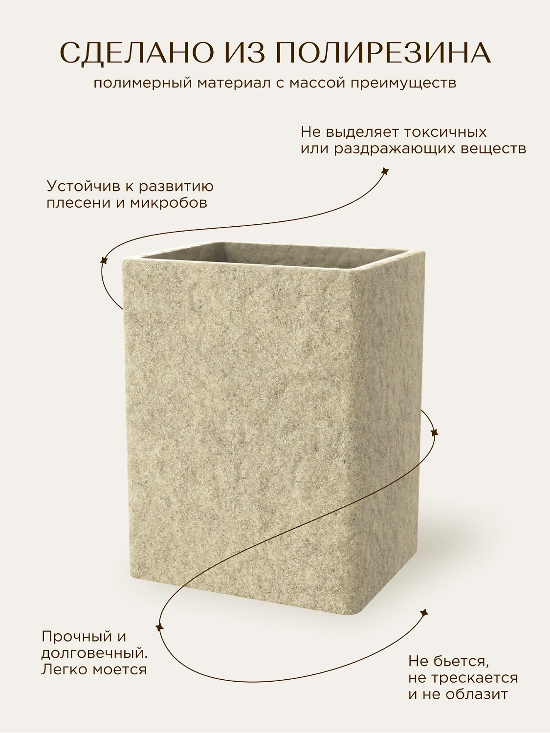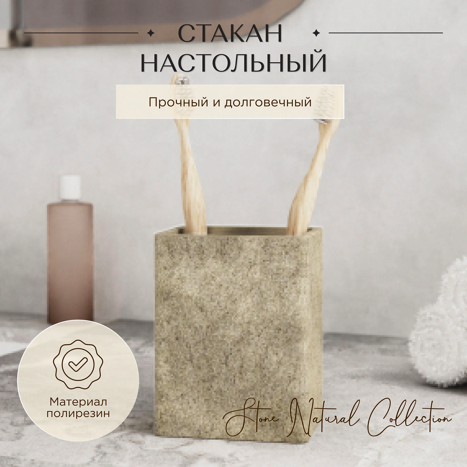 Стакан настольный STONE NATURAL от производителя Fora изготовлен из экологичного, прочного и стойкого к влажности материала полирезин. Аксессуар используется для хранения зубных щеток, пасты и бритв.