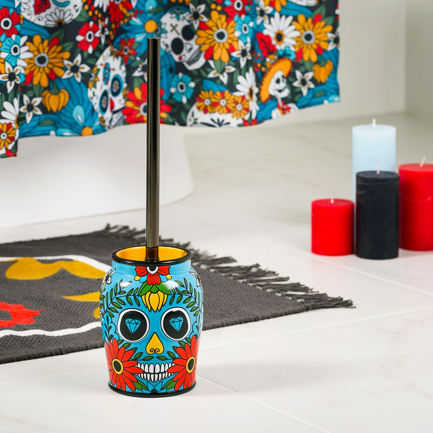 Ершик для унитаза с керамической подставкой с черепом черепа. Изделие стилизовано под один из самых известных мексиканских праздников День Мертвых. Оригинальный дизайн ершика прекрасно сочетается с настольными аксессуарами Los Muertos и другими элементами коллекции - полотенцами, ковриками и занавеской для ванной.