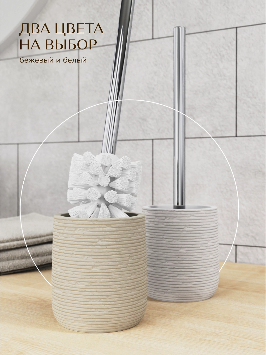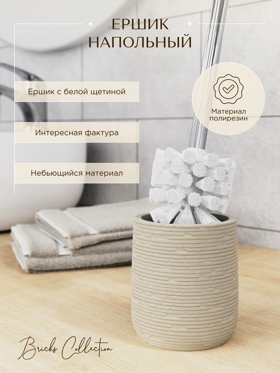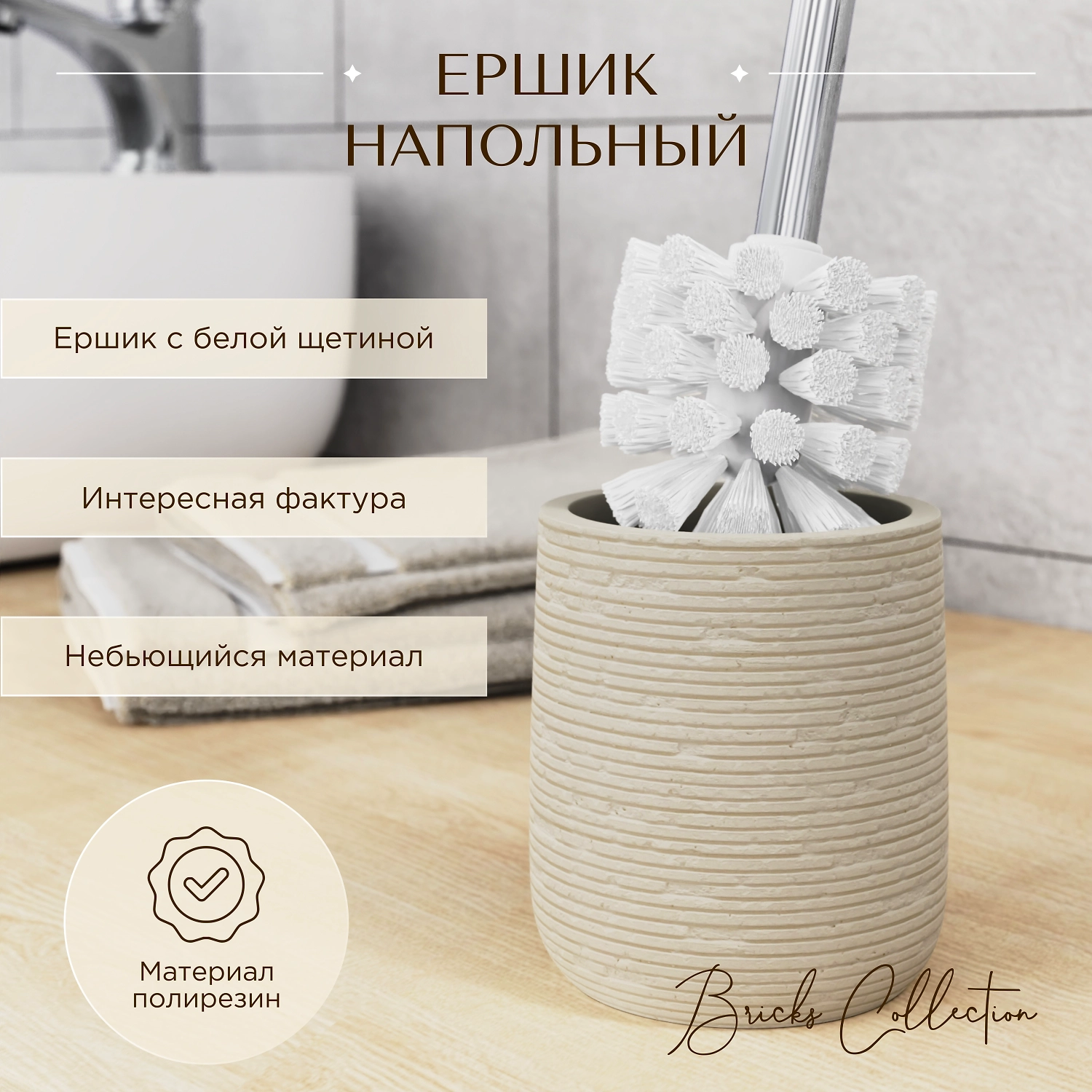 Ершик для унитаза BRICKS от производителя Fora изготовлен из экологичного, прочного, стойкого к влажности материала полирезин, качественного пластика и металла. Изделие выполнено в виде стильной колбы бежевого цвета и ершика с эргономичной хромированной ручкой, отлично вписывается в интерьер современной ванной комнаты и служит долгие годы.