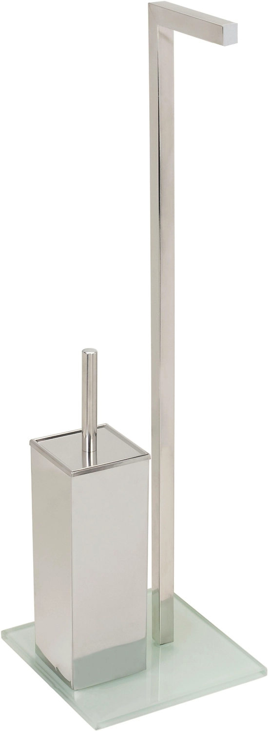 Напольный гарнитур для туалета Mayotte изготовлен из стекла и нержавеющей стали. Ножка - из стекла, держатель щеток и держатель туалетной бумаги из хромированной нержавеющей стали.
