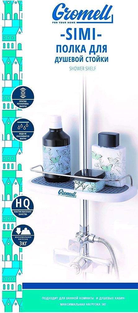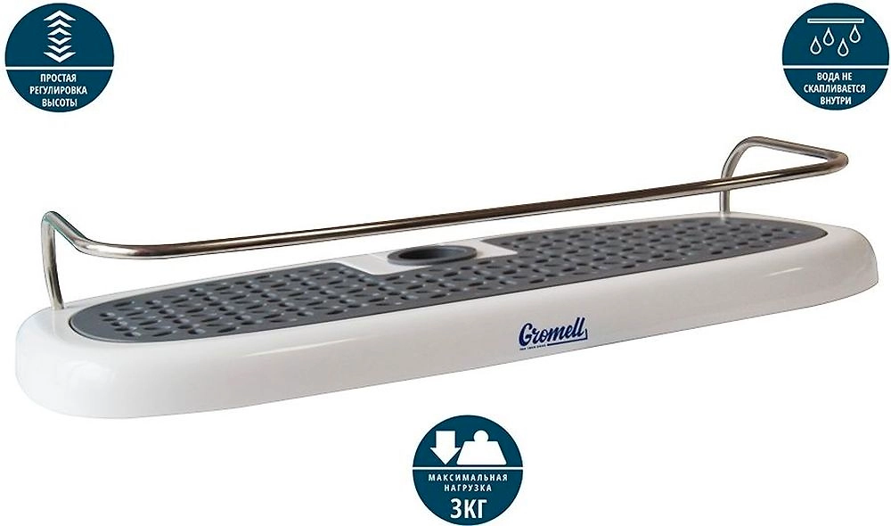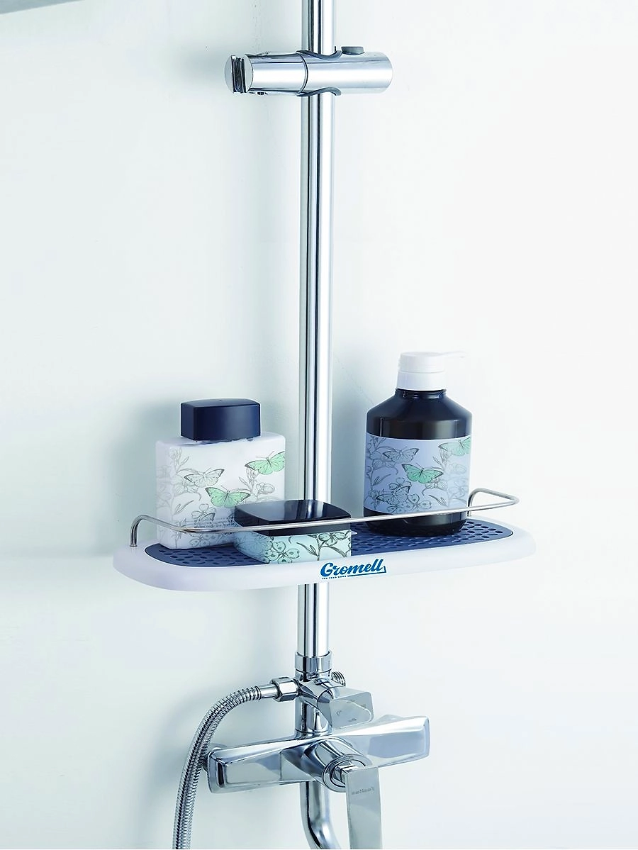 Полка для душевой стойки изготовлена из пластика высокого качества, термопластичной резины и нержавеющей стали. Быстро устанавливается с помощью 2х шурупов.