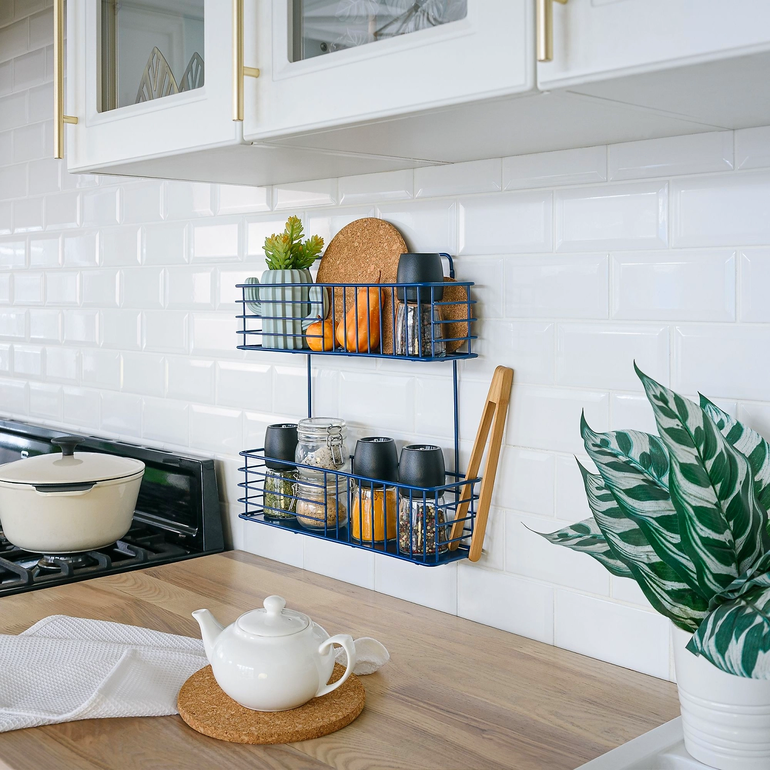 Двухъярусная прямая полка из стали имеет размеры: высота 39,5 см, длина 10,4 см, ширина 38,2 см. Аксессуар изготовлен из прочного металла с устойчивым полимерным покрытием – краской синего цвета.