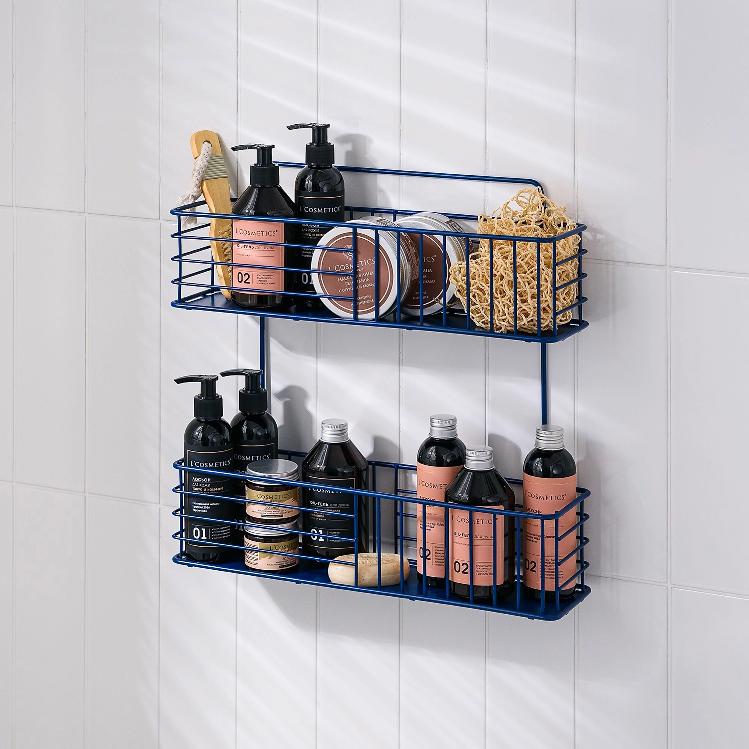 Двухъярусная прямая полка из стали имеет размеры: высота 39,5 см, длина 10,4 см, ширина 38,2 см. Аксессуар изготовлен из прочного металла с устойчивым полимерным покрытием – краской синего цвета. Благодаря специальным добавкам, покрытие придает изделию повышенную твердость, обеспечивает стойкость к коррозии и щелочам, входящим в состав косметических средств и бытовой химии. Полка идёт в комплекте с шурупами из нержавеющей стали. Она легко крепится к стене, легко моется, надолго сохраняет декоративные и эксплуатационные свойства. Благодаря прочному сплаву и надёжному крепежу изделие выдерживает большую нагрузку. Усиленный пруток препятствует деформации в процессе эксплуатации. Аккуратно обработанные края и швы облегчают уход за полкой. Листовое дно и высокий бортик препятствует выпадению содержимого. Современная форма в сочетании с оптимальными размерами делают изделие универсальным для применения не только в ванной, но и во всем доме. Полка идеально сочетается с другими аксессуарами из коллекции Infinity.
