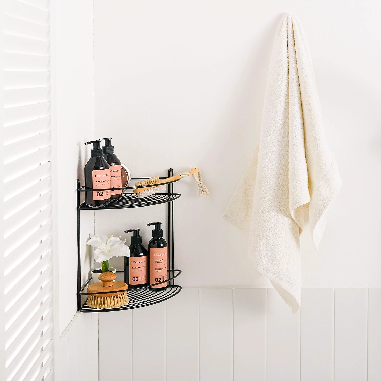 Угловая настенная полка размером 21,8х21,8х31 см имеет два яруса, позволяет сэкономить пространство, обеспечивает удобный доступ к содержимому. Решетчатая конструкция препятствует застаиванию влаги, а высокие бортики не позволят упасть сосудам с уходовой косметикой. Аксессуар изготовлен из прочного металла с устойчивым покрытием краской черного цвета. Для сохранения безупречного внешнего вида полки рекомендуется использовать щадящие моющие средства и мягкую салфетку.