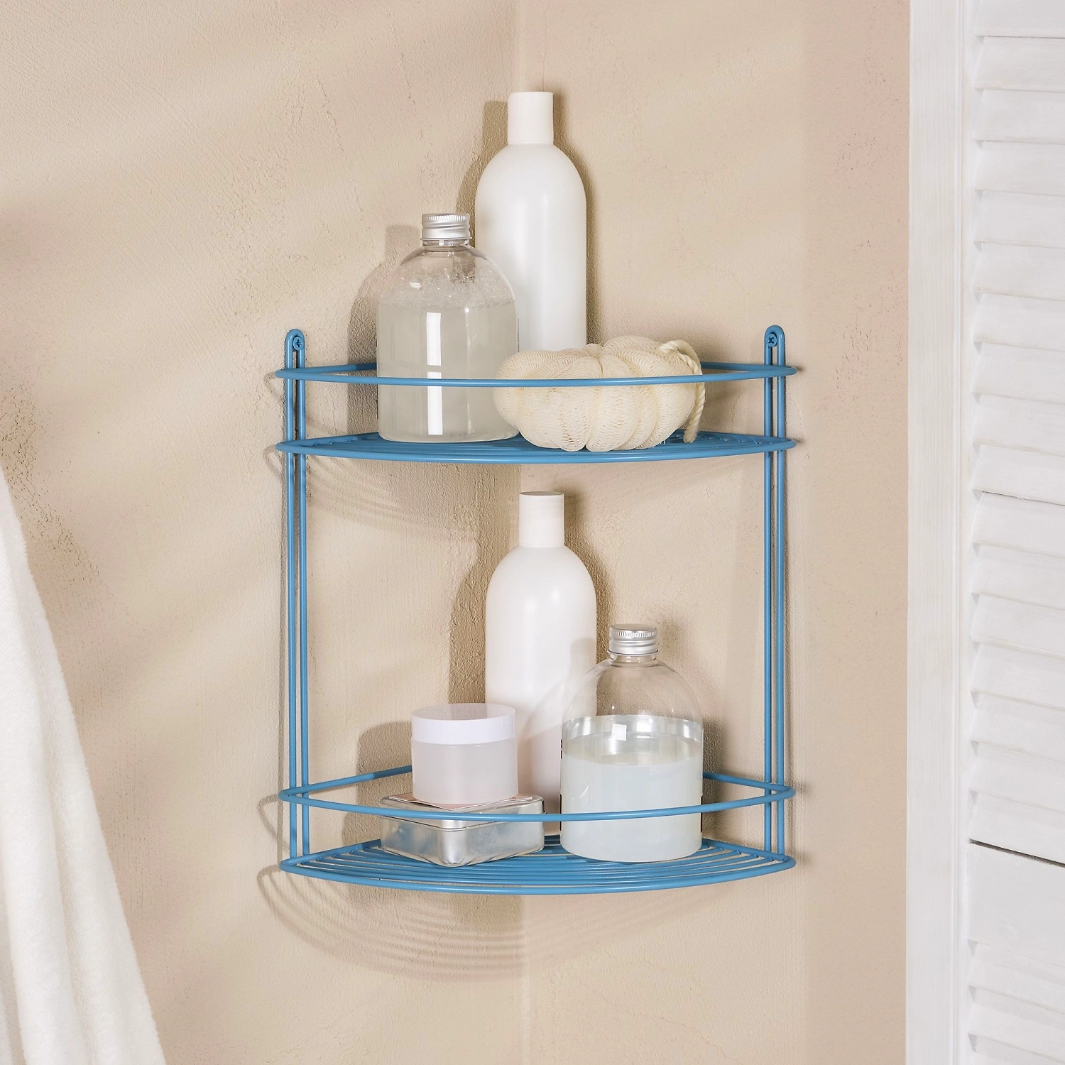 Угловая настенная полка размером 21,8х31х21,8 см имеет два яруса, позволяет сэкономить пространство, обеспечивает удобный доступ к содержимому. Решетчатая конструкция препятствует застаиванию влаги, а высокие бортики не позволят упасть сосудам с уходовой косметикой. Аксессуар изготовлен из прочного металла с устойчивым покрытием краской голубого цвета. Для сохранения безупречного внешнего вида полки рекомендуется использовать щадящие моющие средства и мягкую салфетку. Расстояние между полками -24,1 см. Расстояние от угла до крепления -18,5 см.
