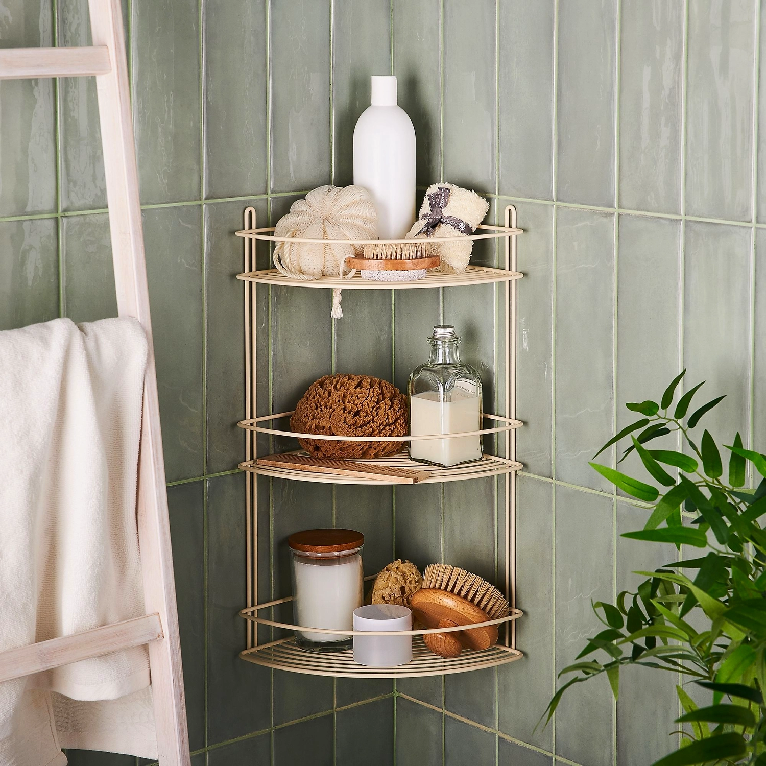 Угловая настенная полка размером 22,2х22,2х47,4 см имеет 3 яруса, позволяет сэкономить пространство, обеспечивает удобный доступ к содержимому. Решетчатая конструкция препятствует застаиванию влаги, а высокие бортики не позволят упасть сосудам с уходовой косметикой. Аксессуар изготовлен из прочного металла с устойчивым покрытием краской бежевого цвета. Для сохранения безупречного внешнего вида полки рекомендуется использовать щадящие моющие средства и мягкую салфетку.