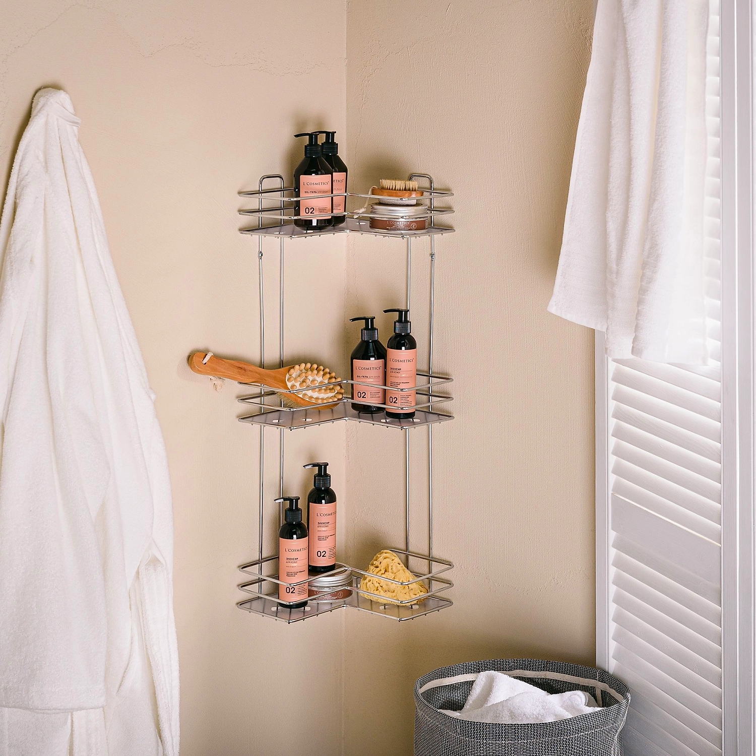 Угловая полка цвета хром размером 24,9×24,9×70,4 см сделана из стали с гальваническим покрытием. Благодаря этому они не ржавеет и надолго сохраняет первозданный внешний вид.