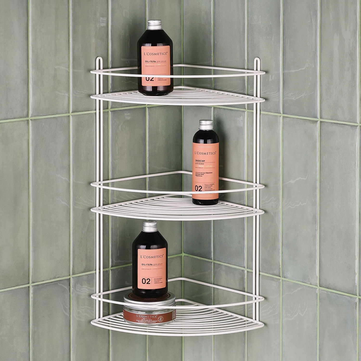 Угловая настенная полка размером 22,2х22,2х47,4 см имеет 3 яруса, позволяет сэкономить пространство, обеспечивает удобный доступ к содержимому. Решетчатая конструкция препятствует застаиванию влаги,а высокие бортики не позволят упасть сосудам с уходовой косметикой. Аксессуар изготовлен из прочного металла с устойчивым покрытием краской белого цвета. Для сохранения безупречного внешнего вида полки рекомендуется использовать щадящие моющие средства и мягкую салфетку.