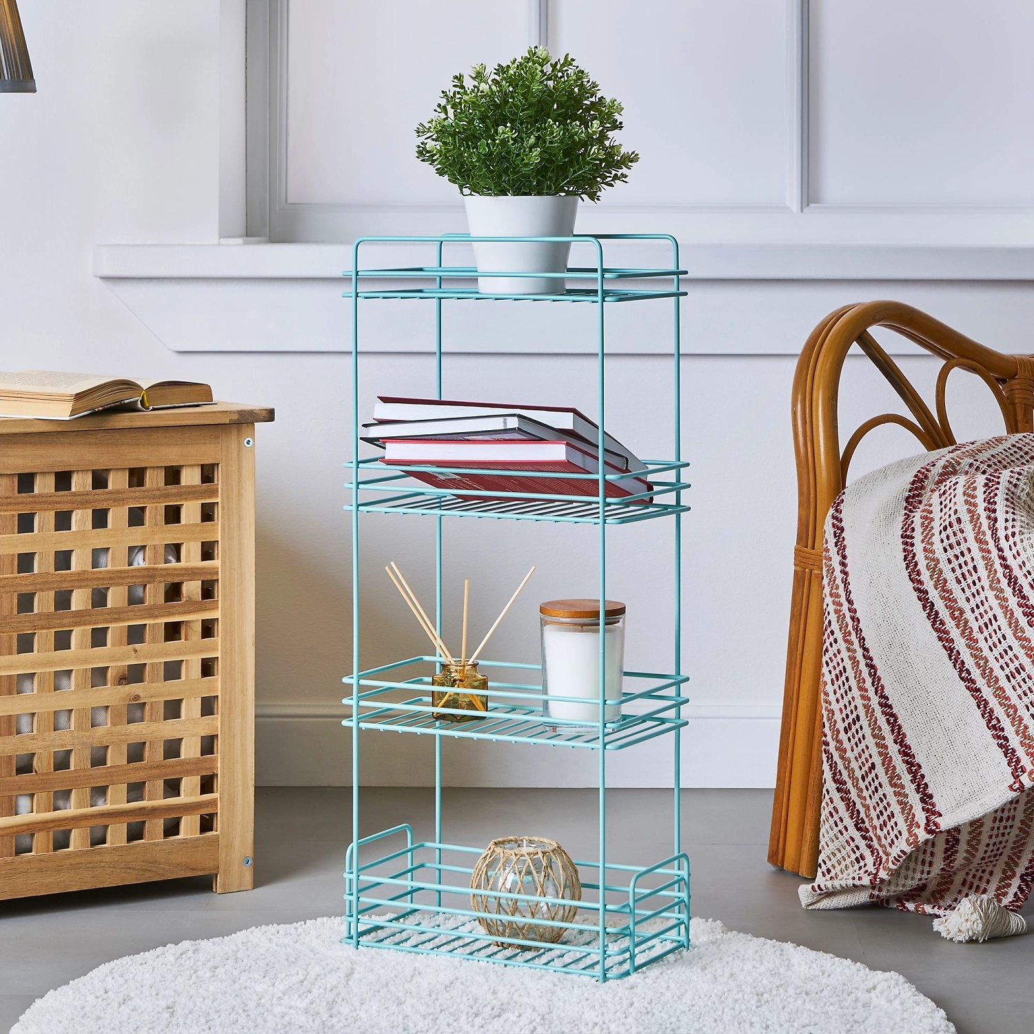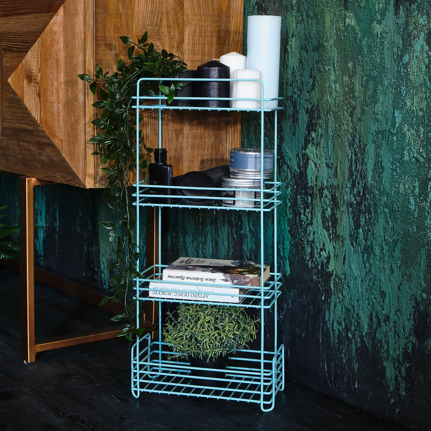 Напольный четырёхуровневый стеллаж из стали имеет размеры: высота 68 см., длина 16 см., ширина 30 см. Аксессуар изготовлен из прочного металла с устойчивым покрытием: краска бирюзового цвета. Полимерное покрытие защищает от коррозии и щелочей в составе косметических средств и бытовой химии, предотвращает появление царапин и трещин. Усиленный пруток выдерживает серьёзную нагрузку и не деформируется. Четыре яруса позволяют комфортно хранить большое количество предметов. Полки стеллажа эстетичны и вместительны, наличие бортика препятствует выпадению содержимого. Аккуратно обработанные края и швы облегчают уход за изделием. Универсальный дизайн аксессуара хорошо впишется как в интерьер ванной, так и любой другой комнаты.