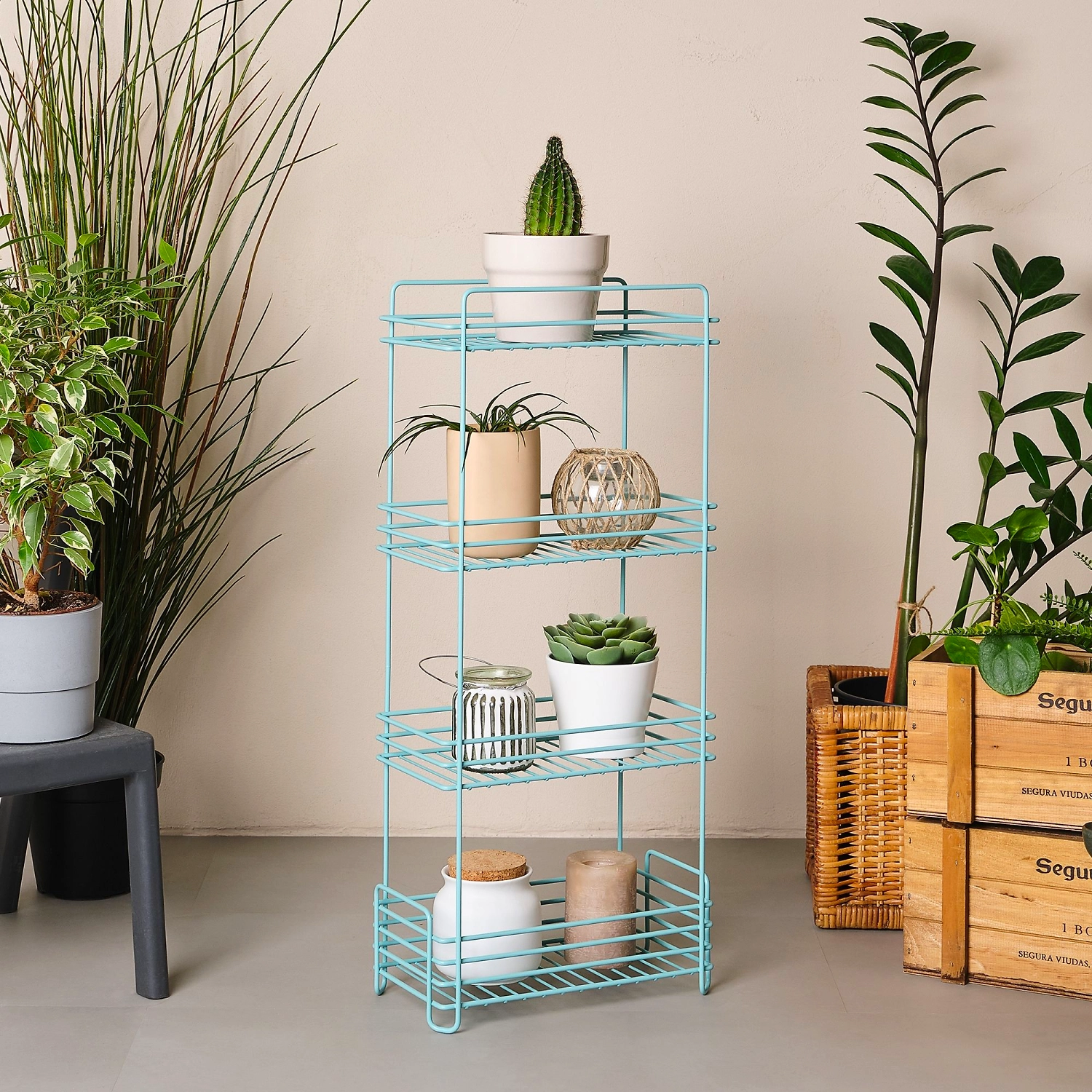 Напольный четырёхуровневый стеллаж из стали имеет размеры: высота 68 см., длина 16 см., ширина 30 см. Аксессуар изготовлен из прочного металла с устойчивым покрытием: краска бирюзового цвета.