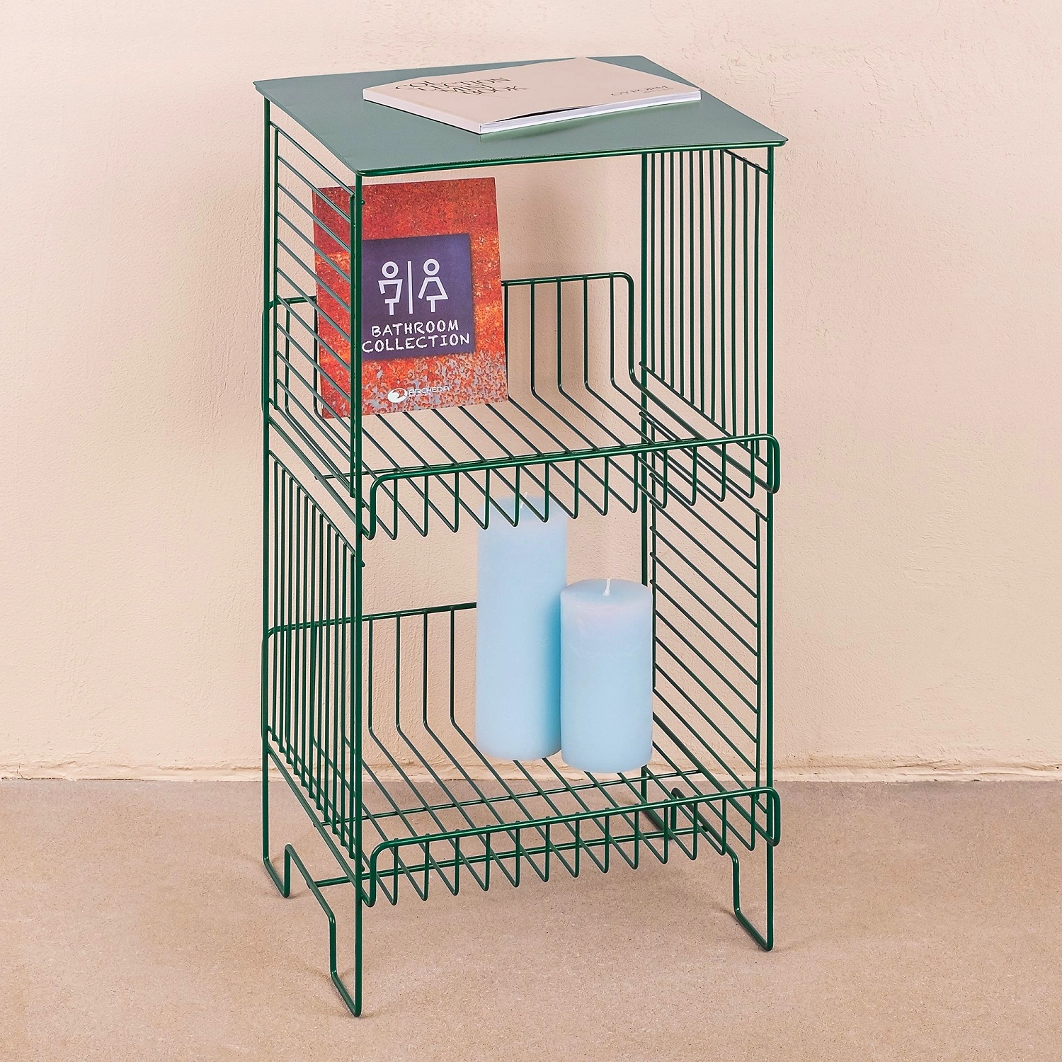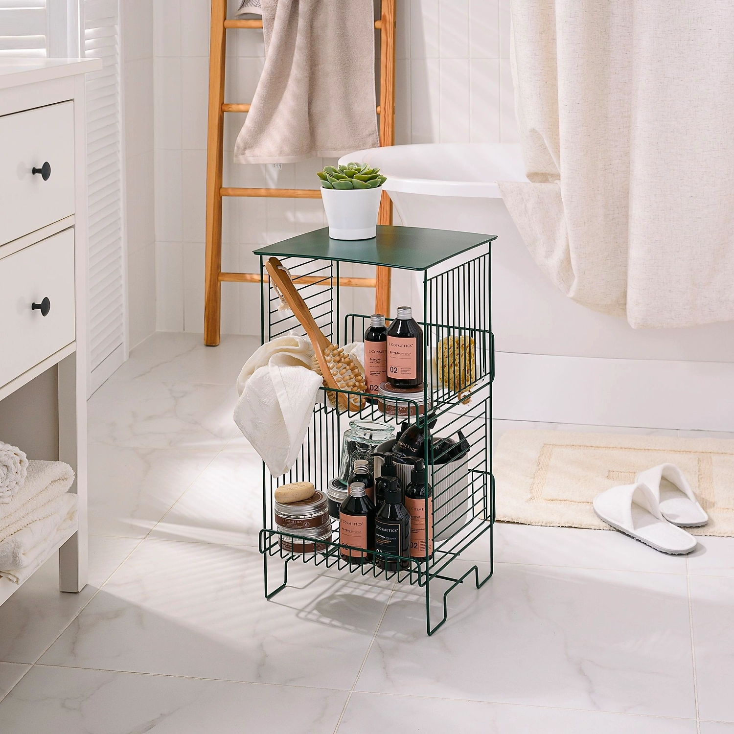 Стеллаж напольный трехуровневый имеет размеры: высота 62,2 см, длина 31,3 см, ширина 31,3 см. Сделан из прочной стали с устойчивым полимерным покрытием - краской зеленого цвета. Благодаря специальным добавкам, покрытие придает изделию повышенную твердость, обеспечивает стойкость к коррозии и щелочам, входящим в состав косметических средств и бытовой химии. Изделие выдерживает до 30 кг и не деформируется. Три яруса позволяют разместить на стеллаже большое количество предметов разной высоты. Расстояние между ярусами - 26,4 см. Современная форма в сочетании с оптимальными размерами делают изделие универсальным для применения не только в ванной, но и во всем доме. Стеллаж идеально сочетается с другими аксессуарами из коллекции Infinity.
