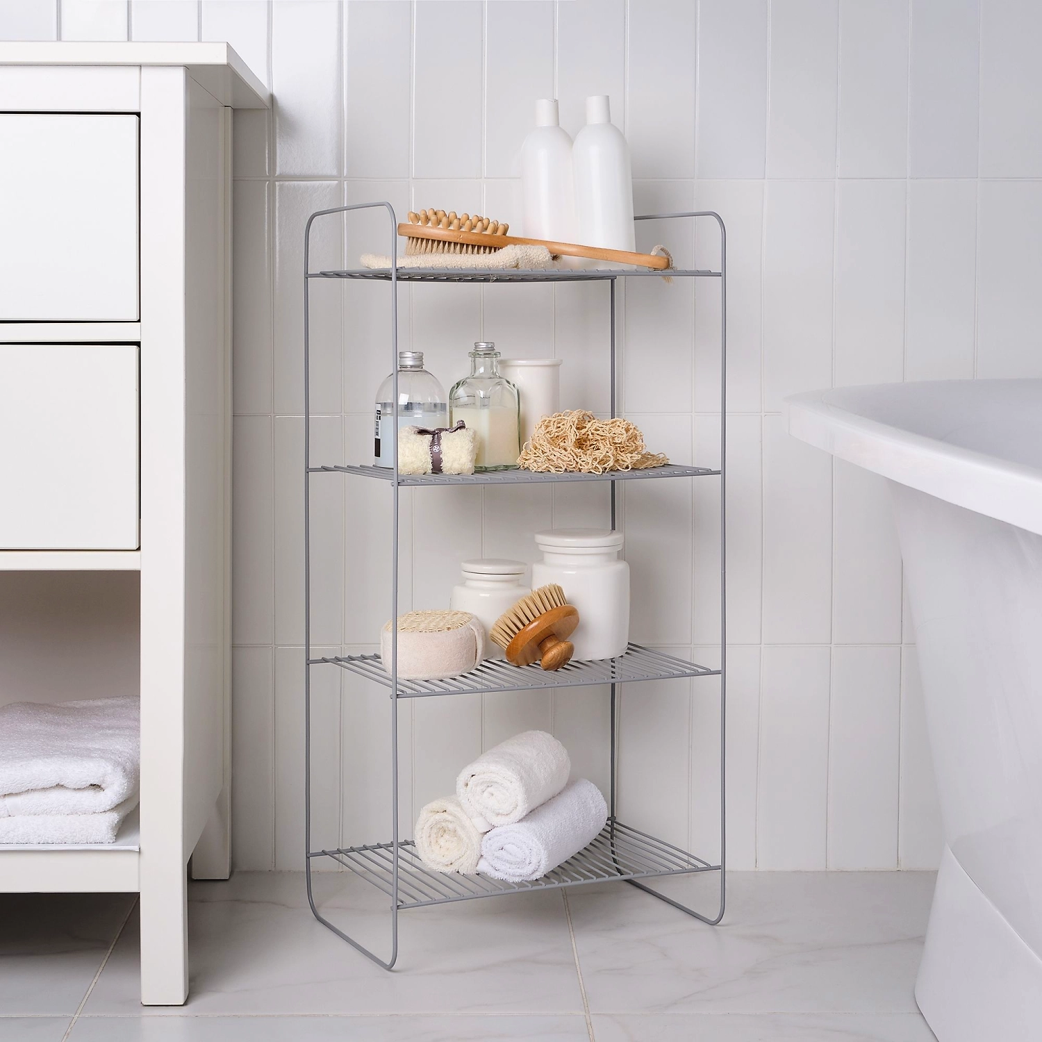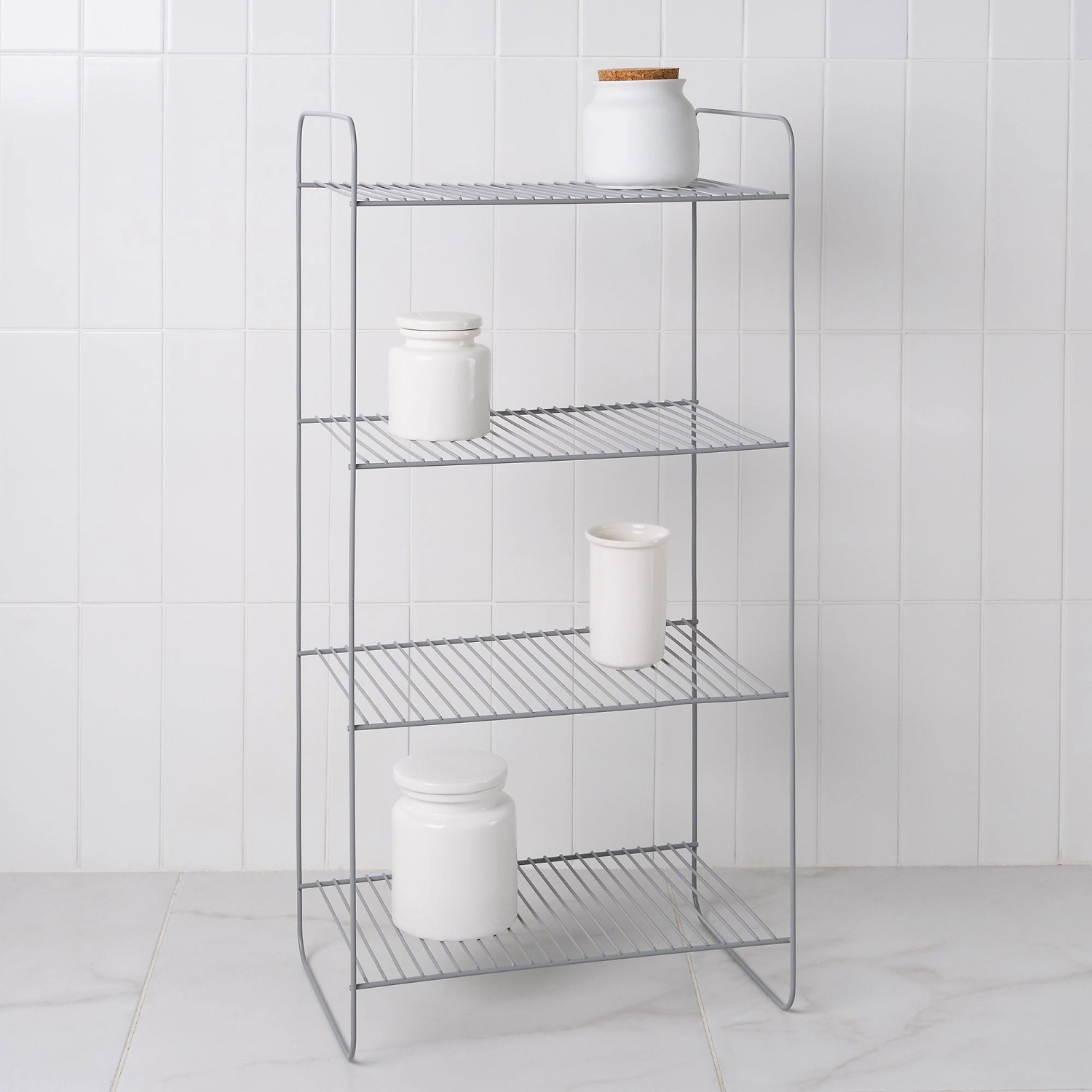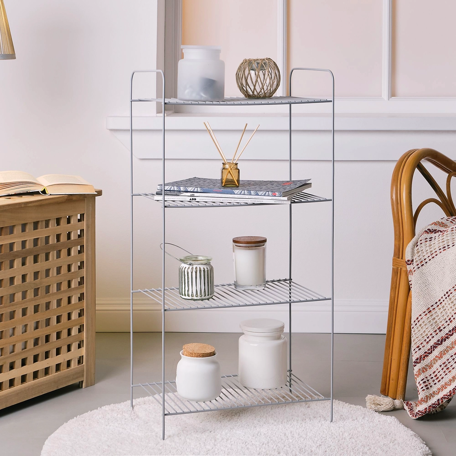 Стеллаж напольный четырёхуровневый имеет размеры: высота 80 см, длина 25 см, ширина 40 см. Сделан из прочной стали с устойчивым к царапинам полимерным покрытием - краской серого цвета. Стеллаж лёгкий, мобильный и очень прочный. Изделие выдерживает до 20 кг и не деформируется. Четыре яруса позволяют разместить на стеллаже большое количество предметов разной высоты. Расстояние между ярусами - 22 см. Современная форма в сочетании с оптимальными размерами делают изделие универсальным для применения не только в ванной, но и во всем доме. Современный дизайн и благородный серый цвет органично впишутся в любой интерьер.