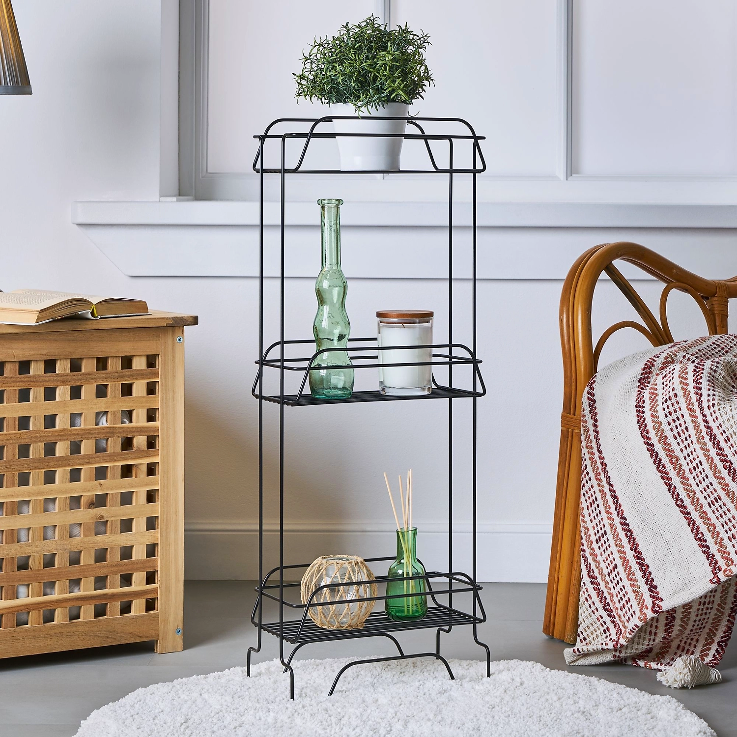 Трёхъярусный напольный стеллаж из стали черного цвета. Размеры: высота 78,5 см, длина 15 см, ширина 30 см. Обладает отличными антикоррозийными свойствами, благодаря чему стеллаж не ржавеет и не подвергается вредному воздействию косметических средств и бытовой химии. Прочный сплав позволяет изделию выдерживать до 20 кг и не деформироваться. Сделан на российском производстве с соблюдением государственных стандартов. Узкий стеллаж поместится в ванной комнате небольшого размера, впишется в любой интерьер и станет отличной системой хранения для большой семьи. Также его можно использовать в других помещениях: например на кухне или в прихожей.